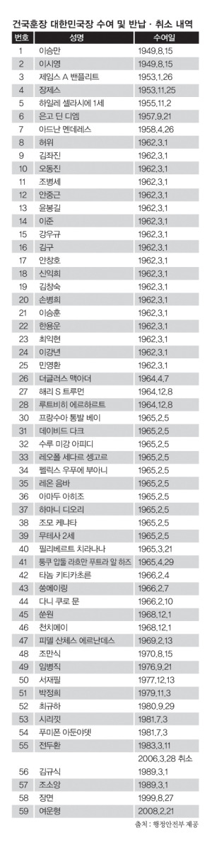 건국훈장 대한민국장 명단은 ‘개인정보’이기 때문에 제공하기 어렵다. 양해 바란다.” 건국훈장 대한민국장 명단을 공개해 달라는 <Weekly 경향>의 요청에 대한 행정안전부 의정관 상훈담당관실의 답변이다.