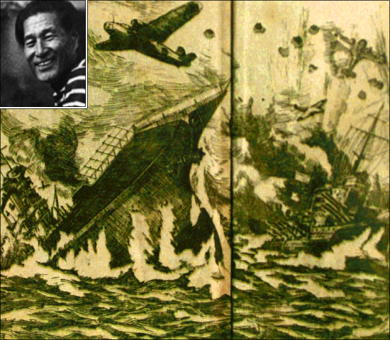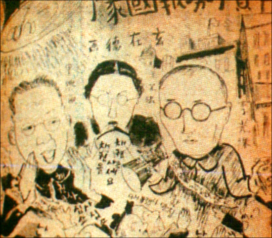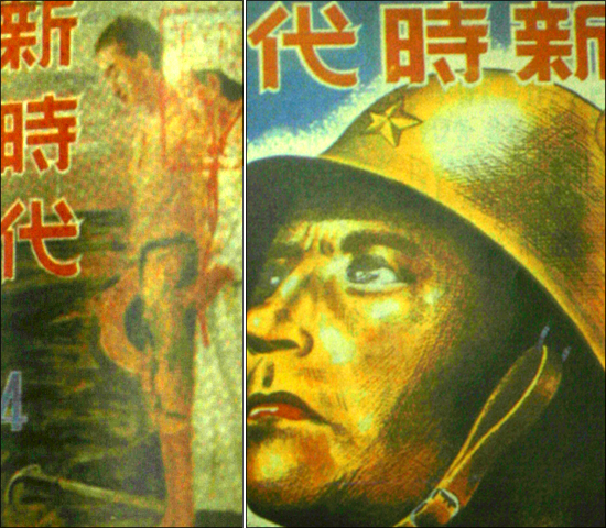 안석주(좌)=고려화회, 서화협회 회원. 프롤레타리아 예술동맹 중앙위원. 황도학회 결성발기인. 임전보국단 발기인. 만화, 삽화, 영화, 비평 분야에서 친일 활동. 대한영화사 이사장. 임건이(우)=신시대, 조광, 춘추에 삽화 연재. 철모를 쓴 병사의 그림 옆 얼굴을 포작했는데, 연한 담채 위에 날카로운 펜의 선묘로 음영을 넣은 독특한 방식을 사용했다. 날카로운 선묘의 중복이 하늘을 응시하며 대공영을 꿈꾸는 병사의 결의를 유감없이 살려낸 군국주의적 색채가 농후한 그림이다.