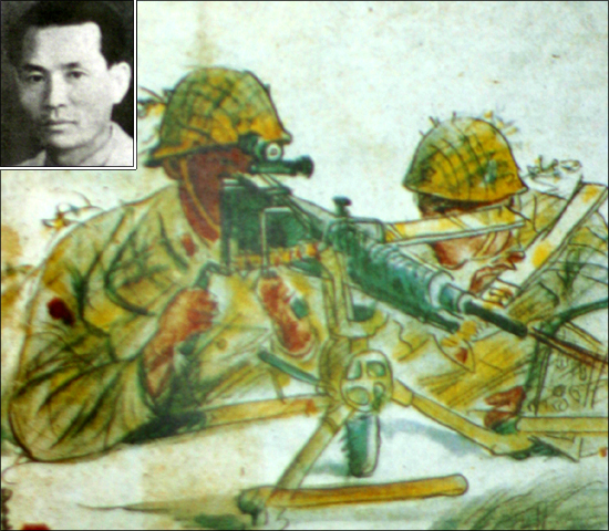 심형구=조선미전 총독상, 추천작가, 심사위원. 조선미술가협회 발기인, 이사, 간사, 평의원, 서양화분과 상임. 황도학회 회원, 국민총력조선연맹 문화부 위원. 구신회, 단광회 회원. 반도총후미술전 초대작가, 결전미술전 심사위원. 이화여대 교수. 열핀스케치와 담채로 기관총을 사격하는 일본국 사수와 조수를 그린 삽화. 예비탄 창을 들고 웅크린 조수나 기관총 사수의 '적'을 향한 눈초리가 매섭다. 조선미전 총독상을 수상했으며 구신회, 단광회 회원이었다.