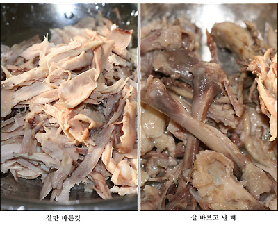-> 닭만 따로 꺼내어 식힌후 살만 발라내어 먹기좋게 찢어 냄비에 담는다.)