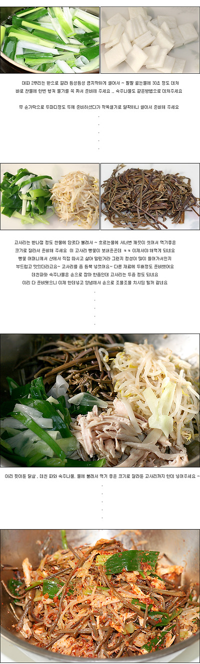 주재료 : 닭1마리, 숙주100g, 고사리50g 부재료 : 대파1뿌리, 마늘4쪽, 다진마늘1큰술, 생강1쪽, 고춧가루4~5큰술, 국간장2큰술, 소금 약간, 물6컵정도