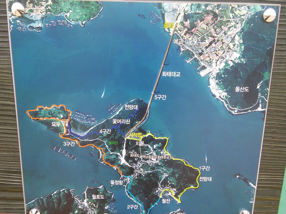 독정항, 묘두, 꽃머리산, 뻘금을 거쳐 화태대교를 건너 돌산 예교로 끝나는 총 5개 구간으로