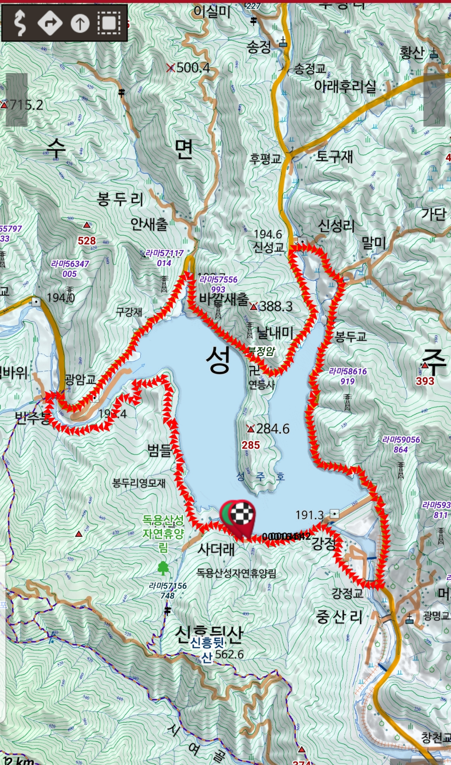 ■코스: 성주군 금수강산면 아라월드-성주호 댐-좌틀-