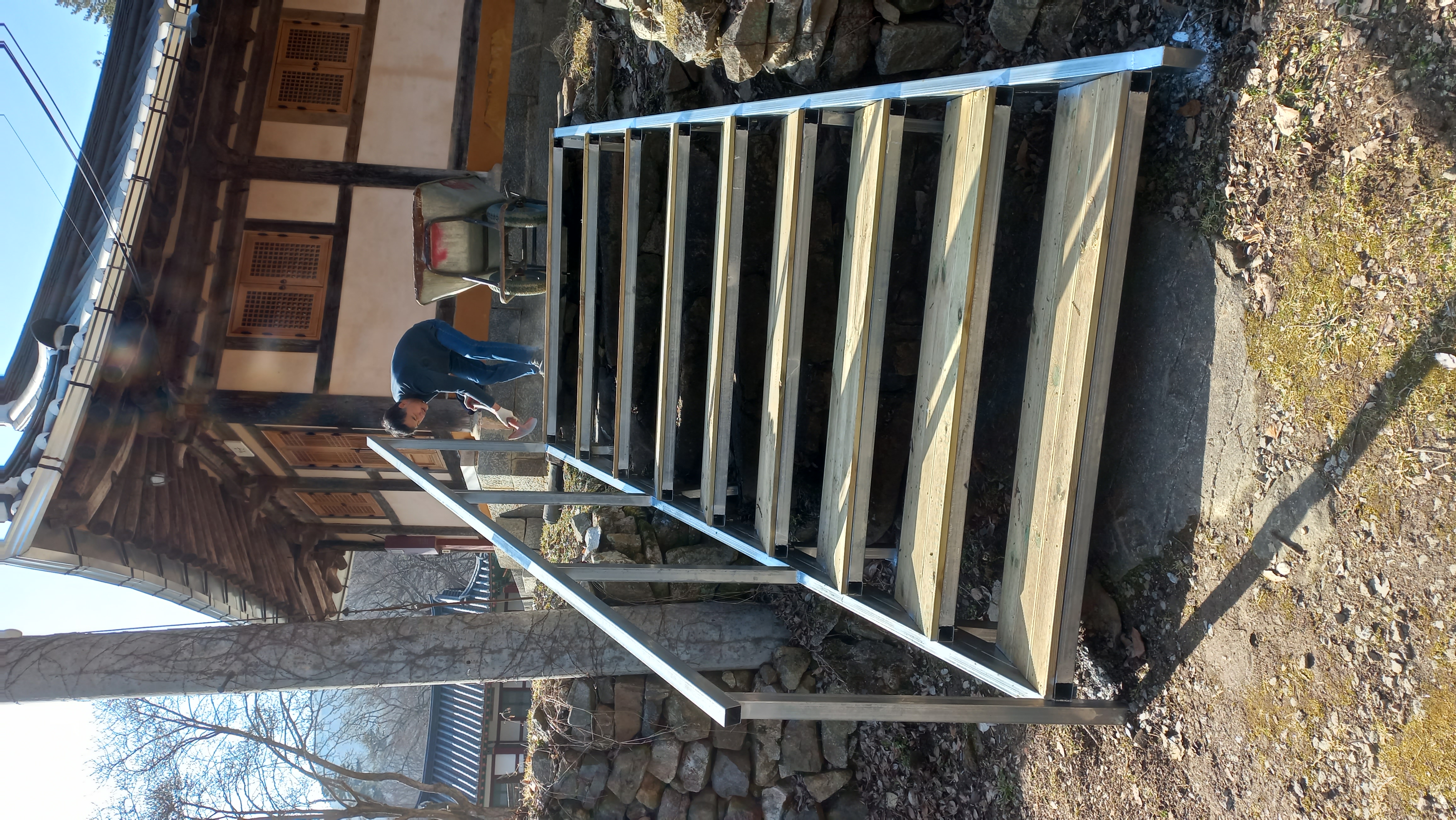 요사체에 머무는 박*석님이 전부터 계단이 가파르다고 보수를 하잔다. 각파이프와 방부목을 써서 계단의 경사를 줄이고 손잡이를 만들자고 최종안이 나오다.