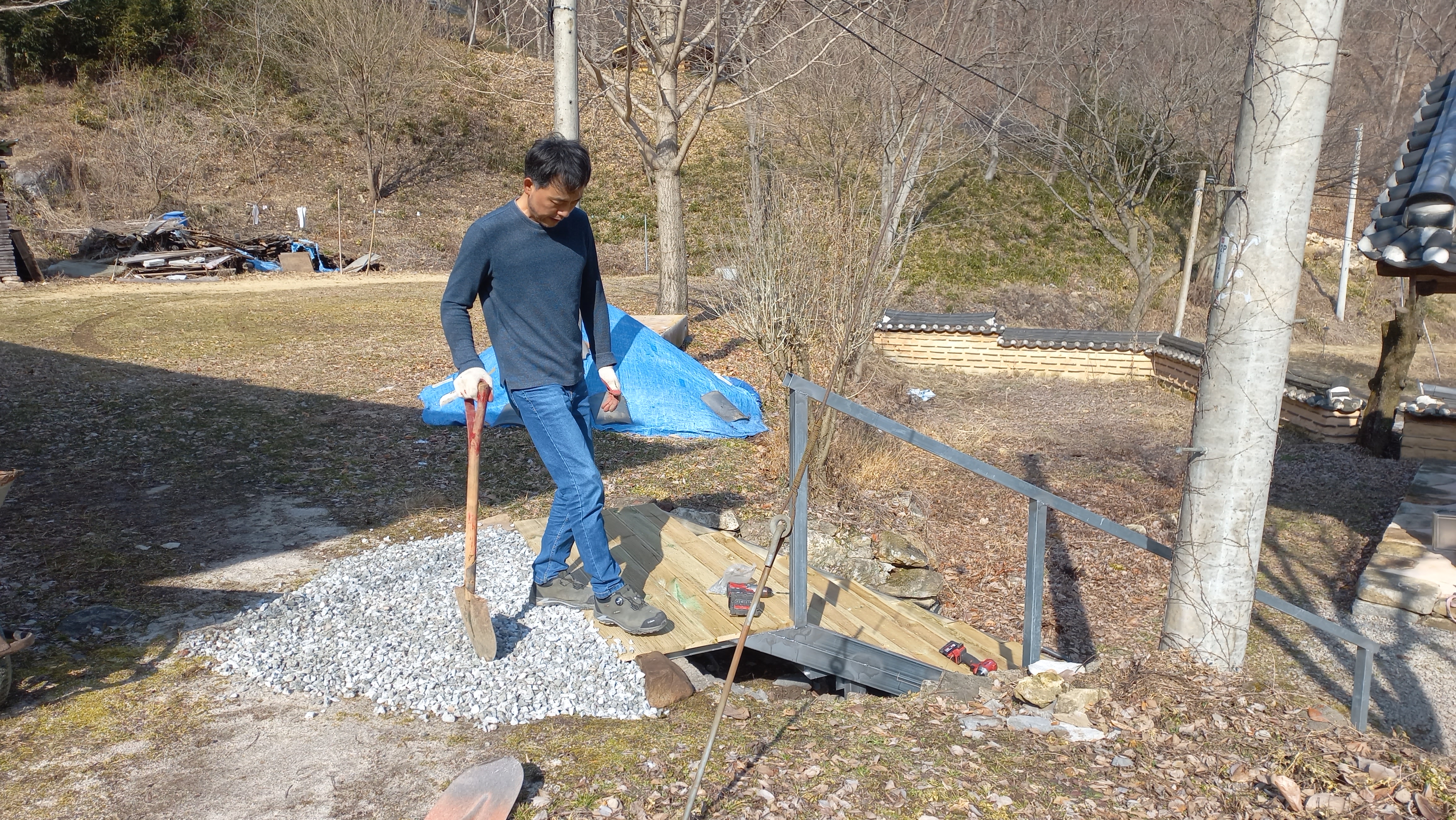 손수레에 잡석을 실어와 위쪽 내딛는 곳의 단차를 메꾸는 세심함까지 ~