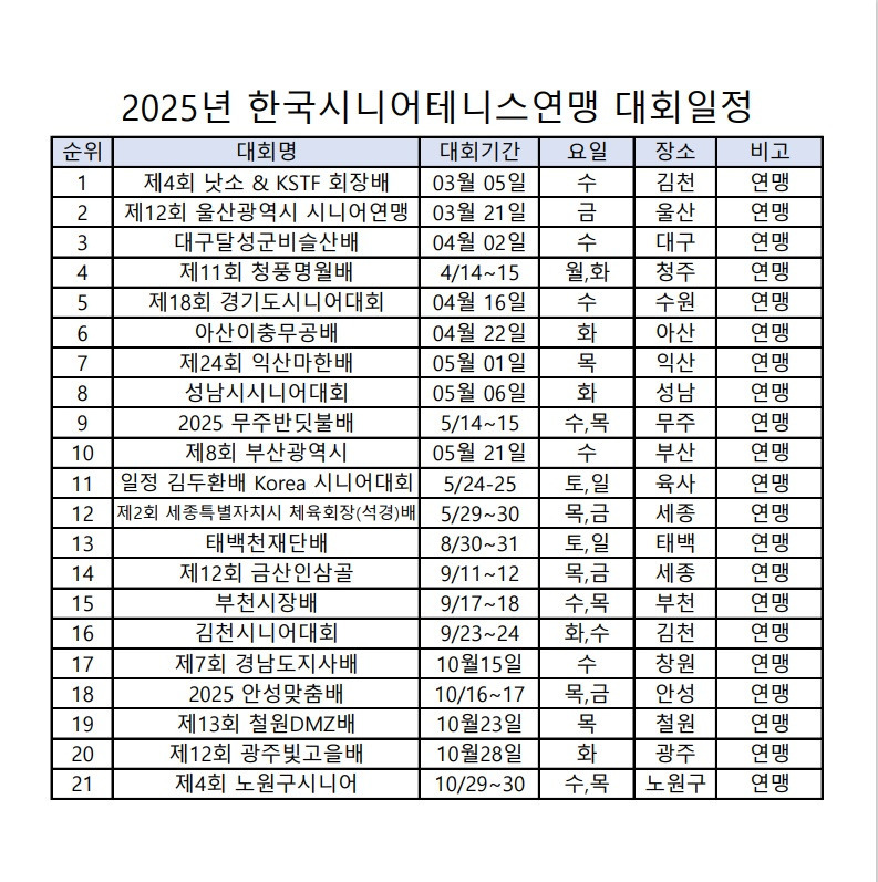 2025 한국 시니어연맹 전국테니스대회 일정 작성자정연각|작성시간25.02.20|조회수471 목록 댓글 0 글자크기 작게가 글자크기 크게가 2025 한국 시니어연맹 대회일정2025-02-20변경 내용 발생 시 즉시 공지하겠습니다. 다음검색 현재 게시글 추가 기능 열기 북마크 공유하기 신고 센터로 신고 댓글 댓글 0 댓글쓰기 답글쓰기 댓글 리스트