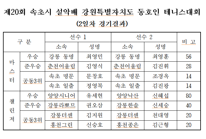 제20회 속초시 설악배 강원 동호인테니스대회 경기결과 작성자강경화 (속초시 전무이사)|작성시간23.09.24|조회수243 목록 댓글 0 글자크기 작게가 글자크기 크게가 제20회 속초시 설악배 강원특별자치도 동호인테니스대회 경기결과보고 : 9월3일 다음검색 현재 게시글 추가 기능 열기 북마크 공유하기 신고 센터로 신고 댓글 댓글 0 댓글쓰기 답글쓰기 댓글 리스트