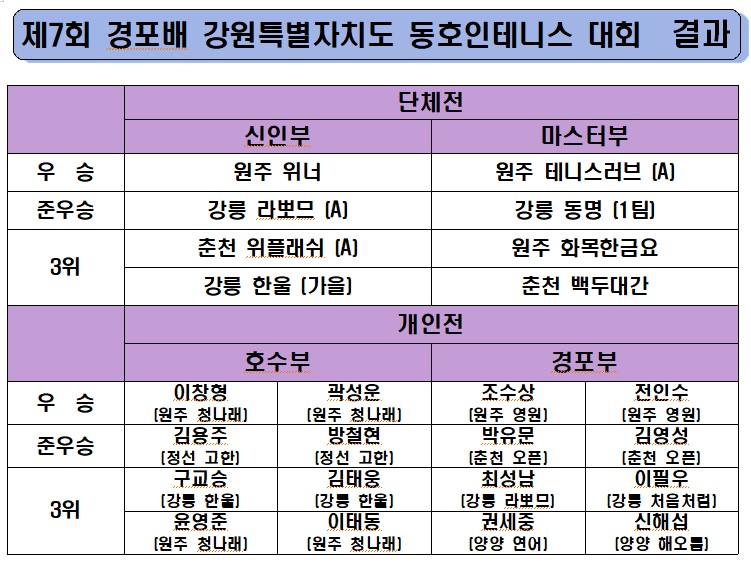 2023년 강릉시 경포배 강원도 동호인 테니스 대회 결과 입니다. 작성자김남우|작성시간23.10.05|조회수278 목록 댓글 1 글자크기 작게가 글자크기 크게가 다음검색 현재 게시글 추가 기능 열기 북마크 공유하기 신고 센터로 신고 댓글 댓글 1 댓글쓰기 답글쓰기 댓글 리스트 작성자위원장 이창형 | 작성시간 23.11.04 반영 댓글 전체보기