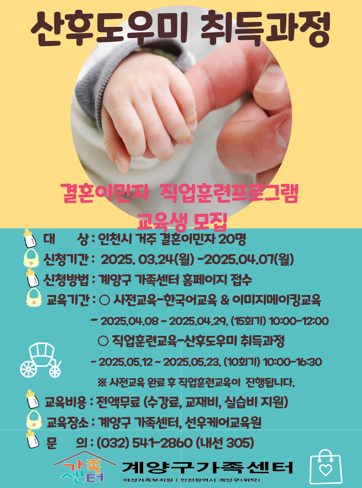 결혼이민자 산후도우미 취득과정 교육생 모집 작성자계양구가족센터|작성시간25.03.25|조회수16 목록 댓글 0 글자크기 작게가 글자크기 크게가 프로그램 문의는 (032) 541-2860 (내선 305) 으로 해 주세요^^ 다음검색 현재 게시글 추가 기능 열기 북마크 공유하기 신고 센터로 신고 댓글 댓글 0 댓글쓰기 답글쓰기 댓글 리스트