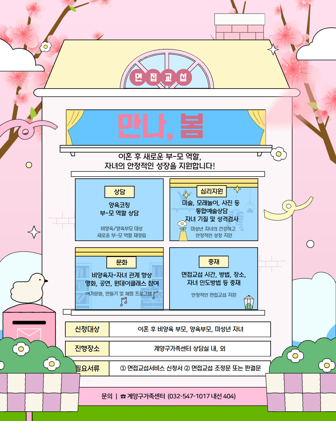 | 2025년 면접교섭서비스 '만나, 봄' 참여자 모집합니다. - 대상 : 이혼 후 비양육 부모, 양육 부모, 미성년 자녀 - 내용 : 미성년 자녀를 둔 이혼 가정을 대상으로 양육코칭, 통합예술상담 등 심리정서적인 면접교섭 지원. 비양육 부‧모와 자녀가 함께 만나 관계 향상을 위한 교육 및 문화활동. - 일정 : 협의 가능 - 장소 : 계양구가족센터 내외 - 문의 : 032-547-1017 (내선 404) 신청링크 : https://gy-hfsc.familynet.or.kr/web/lay1/program/S1T304C450/recruitReceipt/view.do?seq=220499 신청서식 : https://gy-hfsc.familynet.or.kr/center/lay1/bbs/S295T311C312/A/6/view.do?article_seq=209980&cpage=1&rows=10&condition=&keyword= |
