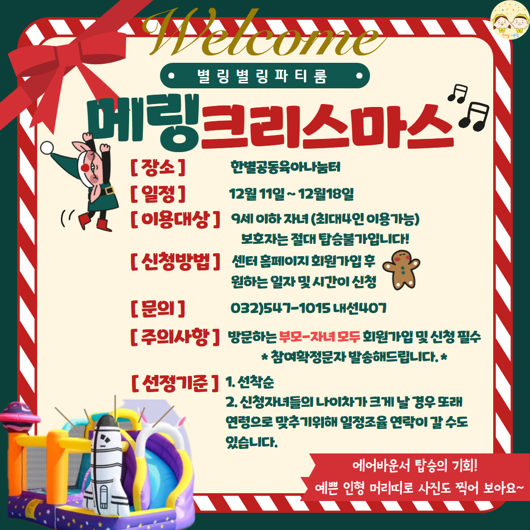 -에어바운스 특성 상 성인이 탑승할 경우 고장의 위험이 있습니다! 보호자는 탑승 불가입니다~