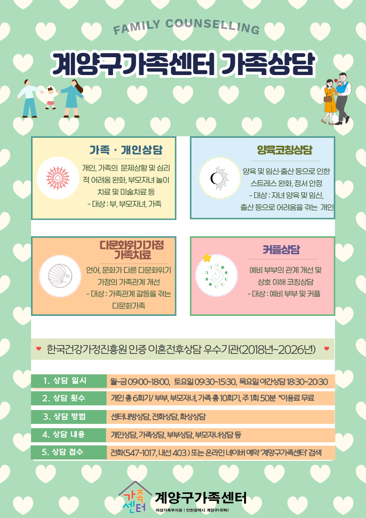 <계양구가족센터 가족상담 참여자 모집>1. 상담일시: 월~금 09:00~18:00, 토요일 09:30~15:30, 목요일 야간상담 18:30~20:302. 상담횟수: 개인 총 6회기/ 부부, 부모자녀, 가족 총10회기, 주1회 50분3. 상담방법: 센터내방상담, 전화상담, 화상상담4. 상담내용: 개인상담, 가족상담, 부부상담, 부모자녀상담5. 상담접수: 전화 032) 541-2860 (내선 403 김인기/ 404 이희진), 센터내방, 네이버예약 '계양구가족센터' 검색https://map.naver.com/v5/search/%EA%B3%84%EC%96%91%EA%B5%AC%EA%B0%80%EC%A1%B1%EC%84%BC%ED%84%B0/place/73288121?placePath=%3Fentry=pll%26from=nx%26fromNxList=true&c=14106852.9212667,4515238.8239185,15,0,0,0,dh 저작자 표시컨텐츠변경비영리 댓글0추천해요0스크랩0