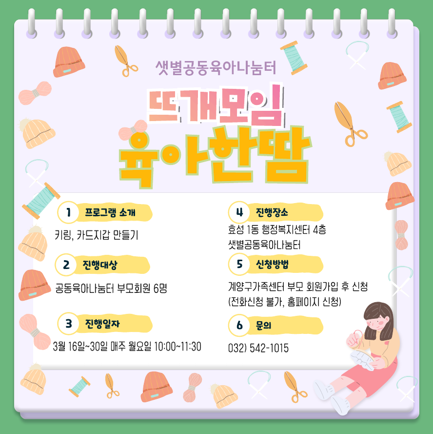 샛별공동육아나눔터 뜨개모임 프로그램 진행 작성자계양구가족센터|작성시간26.02.19|조회수11 목록 댓글 0 글자크기 작게가 글자크기 크게가 다음검색 현재 게시글 추가 기능 열기 북마크 공유하기 신고 센터로 신고 댓글 댓글 0 댓글쓰기 답글쓰기 댓글 리스트