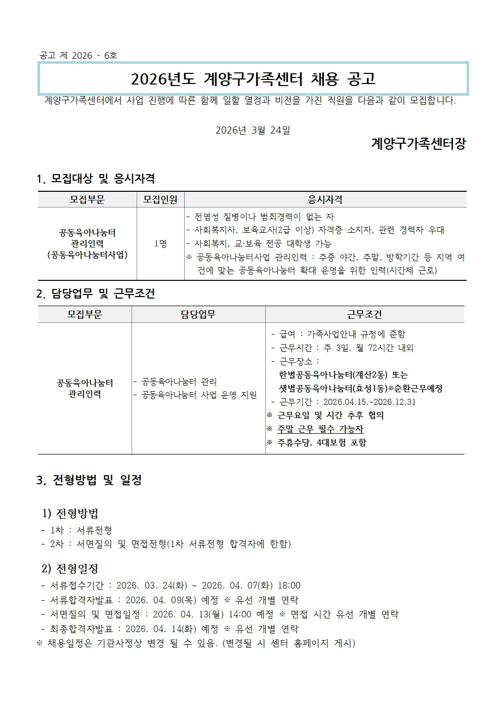2026년도 6차 공동육아나눔터 보조인력 채용공고 작성자계양구가족센터|작성시간26.03.24|조회수6 목록 댓글 0 글자크기 작게가 글자크기 크게가 2026-6 채용공고 및 응시원서(홍길동).hwp71.50KB 첨부파일첨부된 파일이 3개 있습니다. jpg 파일 2026-6 채용공고 및 응시원서(공동육아관리인력)_연장 공고-002.jpg 다운로드 jpg 파일 2026-6 채용공고 및 응시원서(공동육아관리인력)_연장 공고-001.jpg 다운로드 hwp 파일 2026-6 채용공고 및 응시원서(홍길동).hwp 다운로드 다음검색 현재 게시글 추가 기능 열기 북마크 공유하기 신고 센터로 신고 댓글 댓글 0 댓글쓰기 답글쓰기 댓글 리스트