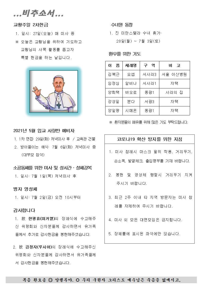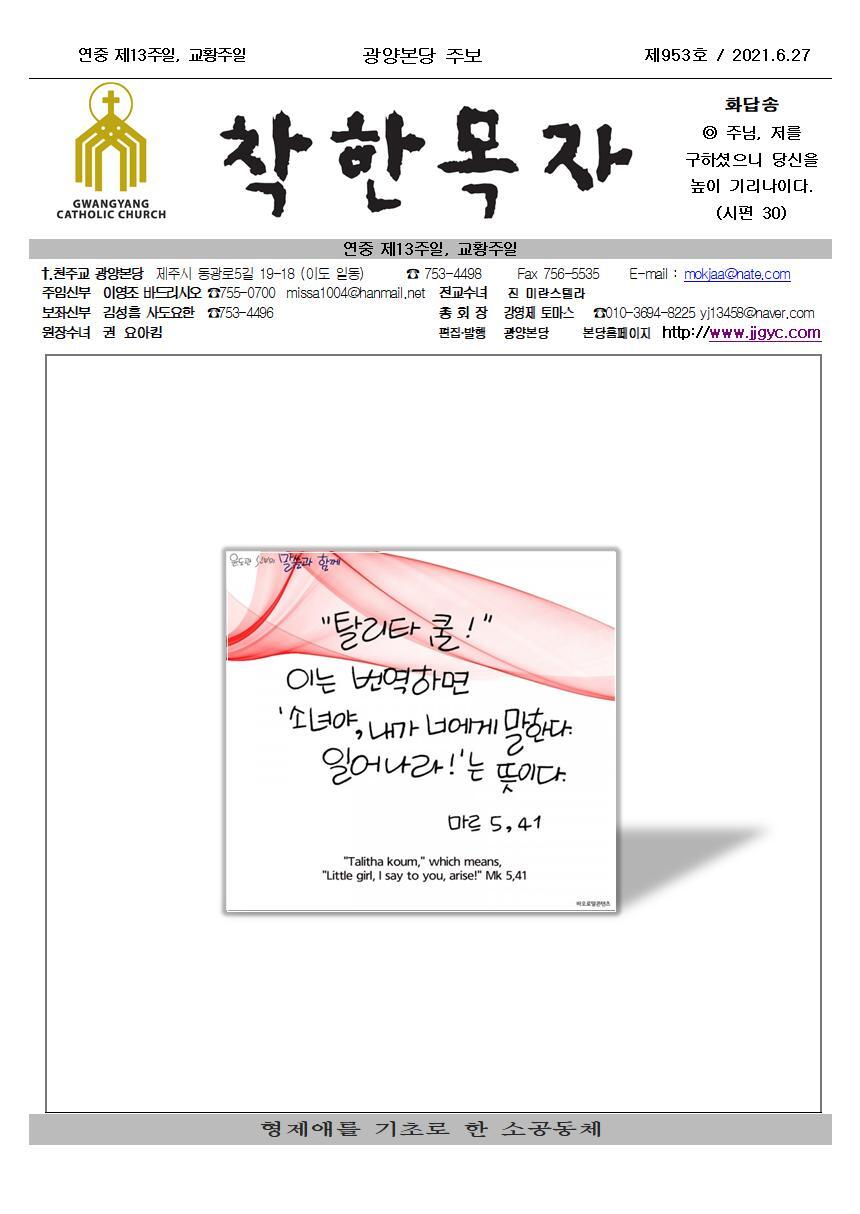 제953호 2021.6.27. (연중 제13주일, 교황주일) 작성자최순자 데레사|작성시간21.06.26|조회수183 목록 댓글 0 글자크기 작게가 글자크기 크게가 제953호 2021.6.27. (연중 제13주일, 교황주일) 다음검색 현재 게시글 추가 기능 열기 북마크 공유하기 신고 센터로 신고 댓글 댓글 0 댓글쓰기 답글쓰기 댓글 리스트
