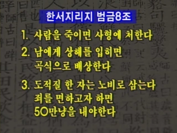 중국의 기록 속에 고조선의 국가체제를 알려주는 단서가 있다. 한서지리지가 전하는 고조선의 범금8조. 현재 3개항만 남아있는데 사람을 죽이면 사형에 처하고 남에게 상해를 입히면 곡식으로 배상하고 도적질한 자는 노비로 삼는 것이 그 내용이다.