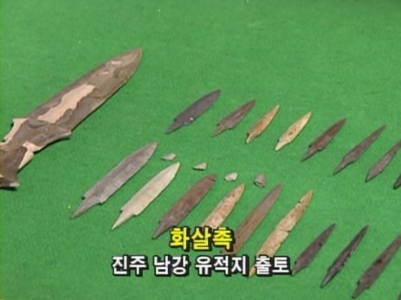 진주 남강. 그곳엔 4500년 전의 유적이 고스란히 남아 있었다 .무려 110만평에 이르는 국내 최대의 청동기 유적이었다. 지금은 그 흔적을 찾을 수 없지만 당시의 발굴기록은 흥미로운 사실을 전한다. 무덤 안에 있는 이 인골은 특이한 형태로 매장되어 있다. 목 위의 머리 부분이 보이지 않는 것이다. 머리가 없는 인골, 이것은 당시 전쟁이 있었다는 증거가 아닐까? 과연 당시에 전쟁이 있었는지 인골과 함께 출토된 유물들을 살펴보았다. 유물중의 상당수가 칼과 도끼 등 다양한 종류의 무기였다.