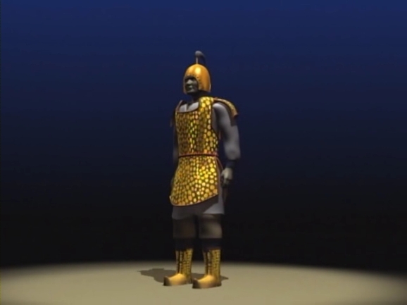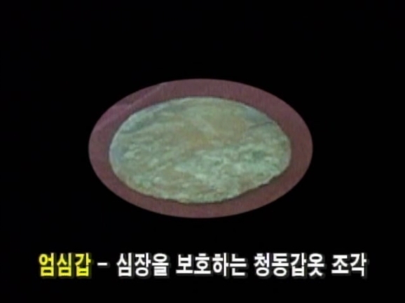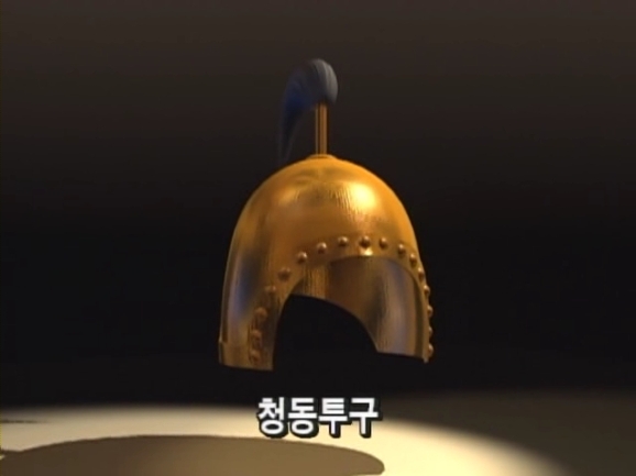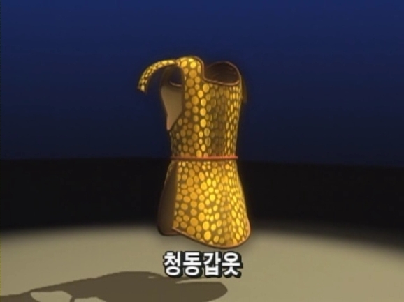 또 중국의 고조선 유적에서는 장방형의 청동갑옷 조각과 함께 심장을 보호하는 엄심갑도 출토됐다. 갑옷이 있었다는 증거였다. 고조선의 갑옷을 복원해 보기로 했다. 고조선의 갑옷은 이렇게 가죽옷 위에 크고 작은 청동단추를 빈틈없이 매달았을 것이다. 이것이 고조선 청동갑옷의 초기형태일 것이다. 고조선 유적에서는 청동단추로 장식한 청동투구도 발굴됐다. 이것이 고조선 군인들이 사용했던 청동투구다.