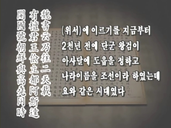 인터뷰) 단군은 고조선 시대의 최고통치자에 대한 칭호거든요. 오늘날 같으면 대통령 그런 의미도 될 수 있겠고 중국의 천자와 같은 그런 의미입니다. 우리 조상들은 해를 하늘의 상징으로 보고 해의 아들이란 뜻으로서 소위 해머슴애 단군, 단군이 바로 해의 아들이란 뜻인데 하느님의 아들이란 뜻이죠. 우리 조상들은 고조선 시대에 최고 통치자를 하느님의 아들이다 그런 뜻으로 단군이라 불렀던 것 같습니다. (10:31)