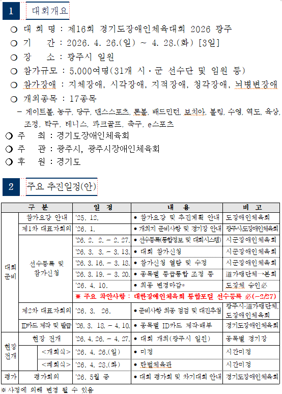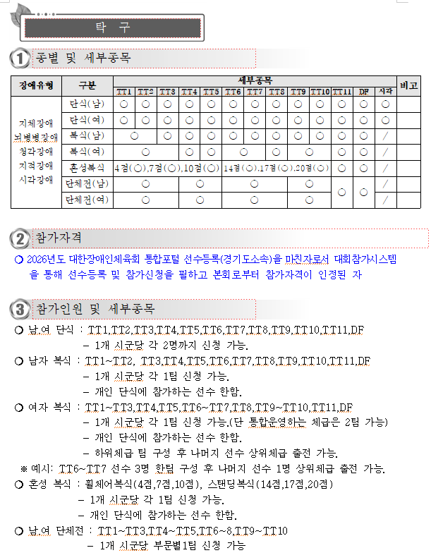 제16회 경기도장애인체육대회 2026 광주 참가요강 작성자[경기도장애인탁구협회]|작성시간26.01.06|조회수540 목록 댓글 1 글자크기 작게가 글자크기 크게가 제16회 경기도장애인체육대회 2026 광주 참가요강_최종.hwp1.57MB 첨부파일첨부된 파일이 10개 있습니다. png 파일 image.png 다운로드 png 파일 image.png 다운로드 png 파일 image.png 다운로드 png 파일 image.png 다운로드 png 파일 image.png 다운로드 png 파일 image.png 다운로드 png 파일 image.png 다운로드 png 파일 image.png 다운로드 png 파일 image.png 다운로드 hwp 파일 제16회 경기도장애인체육대회 2026 광주 참가요강_최종.hwp 다운로드 다음검색 현재 게시글 추가 기능 열기 북마크 공유하기 신고 센터로 신고 댓글 댓글 1 댓글쓰기 답글쓰기 댓글 리스트 작성자박종희-TM8안양 | 작성시간 26.01.12 대회요강 첨부파일 로 올려주시면 보기에 더 좋을거 같습니다^^ 댓글 전체보기