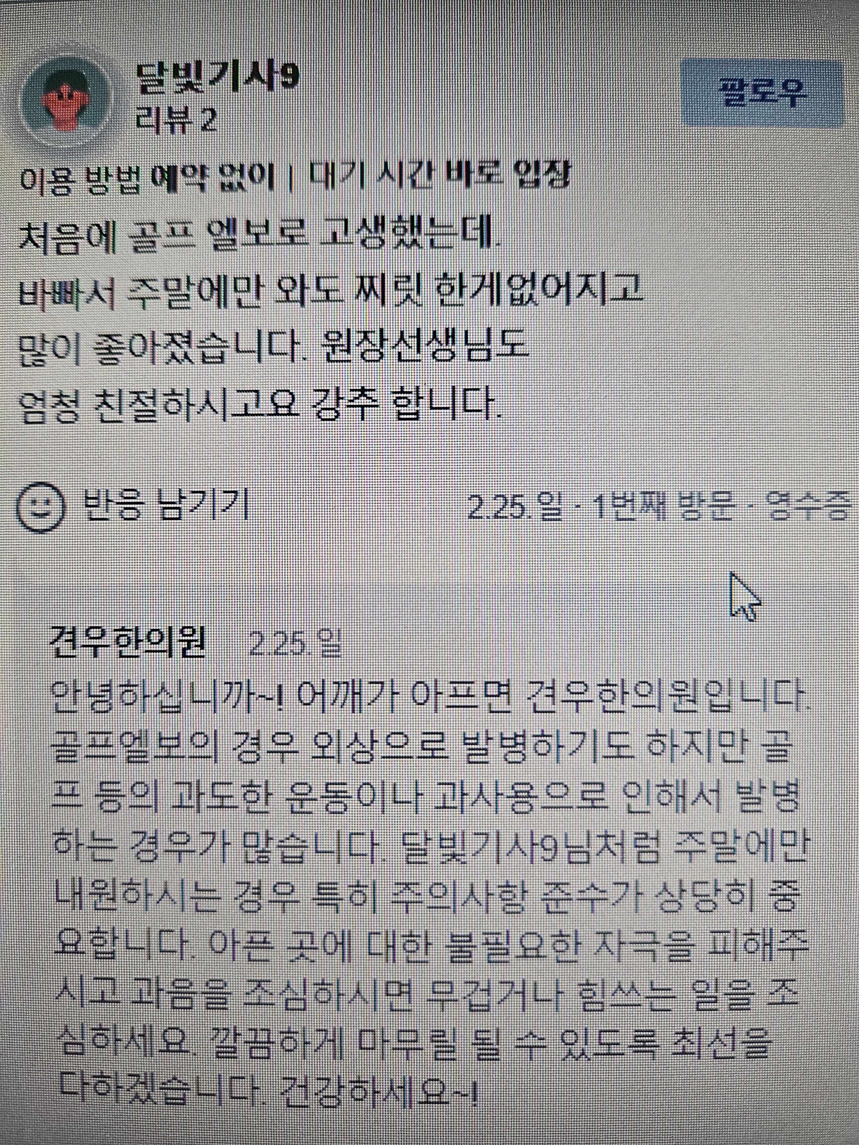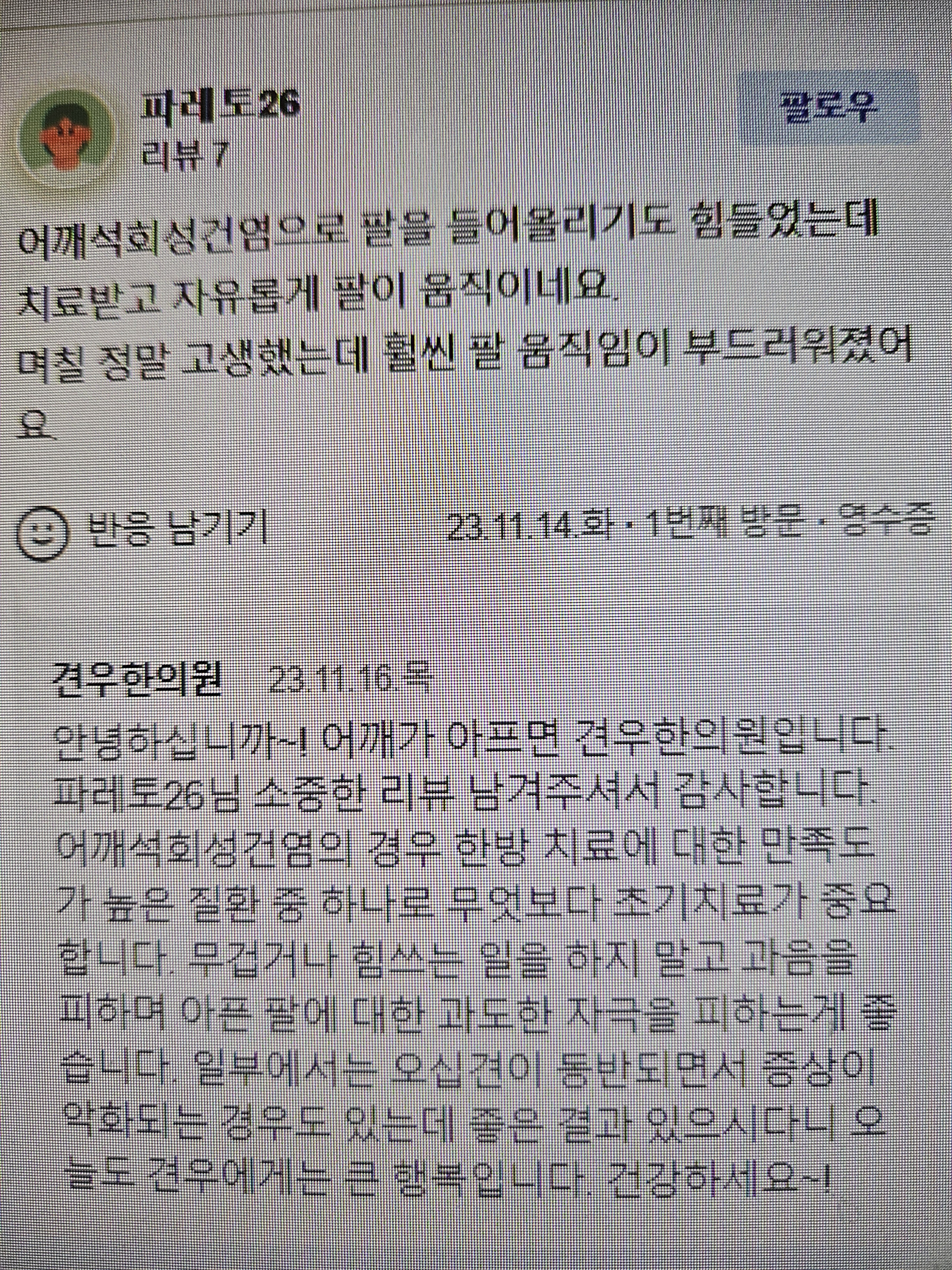 답댓글 작성자견우 작성자 본인 여부 작성자 작성시간 24.05.27 안녕하십니까~! 어깨가 아프면 견우한의원입니다. 낮에 뜨는 달님 견쇄관절염으로 많이 힘드시죠? 견쇄관절염의 경우 외상으로 발병하기도 하지만 대개는 생활습관과 연계돼서 발병하는 경우가 많습니다. 한쪽으로 수면을 취한다던가 컴퓨터나 스마트폰 등을 할때 내려본다던가 아픈 곳을 자꾸 만진다던가 등의 생활습관과 많은 관련이 있습니다. 그래서 일단 발병하게 되면 아픈 곳을 만지지 말고 가급적 시선을 눈높이로 하면서 과음을 피하고 엎드리거나 누워서 돌아누워서 화장실에서 헨드폰 사용을 자제하는게 좋습니다, 가까운 곳에 계시다면 본원에 내원하시어 치료 받으시면 좋지만 그렇지 않다면 계신 곳에서 가까운 곳의 한의원에 가시어 적절한 치료를 이어가셨으면 합니다. 건강하세요~!