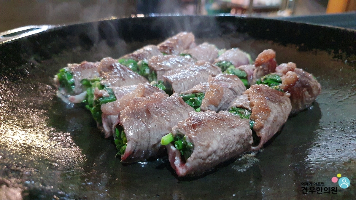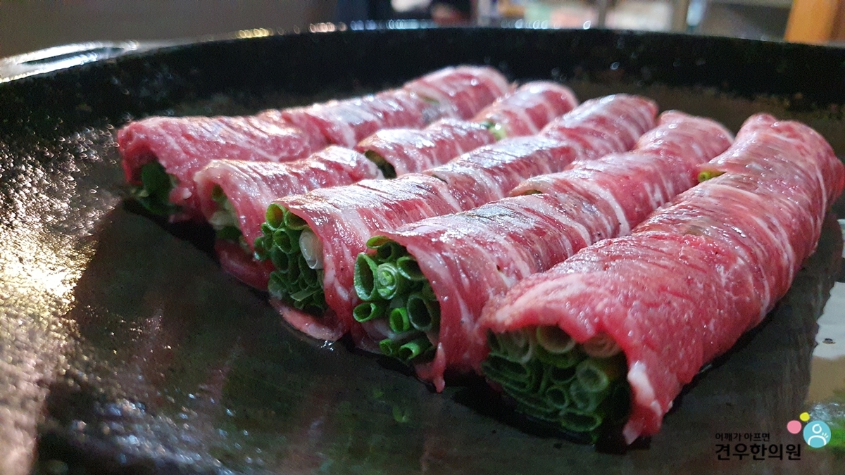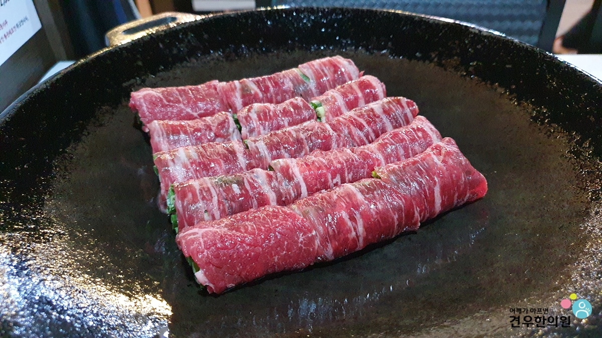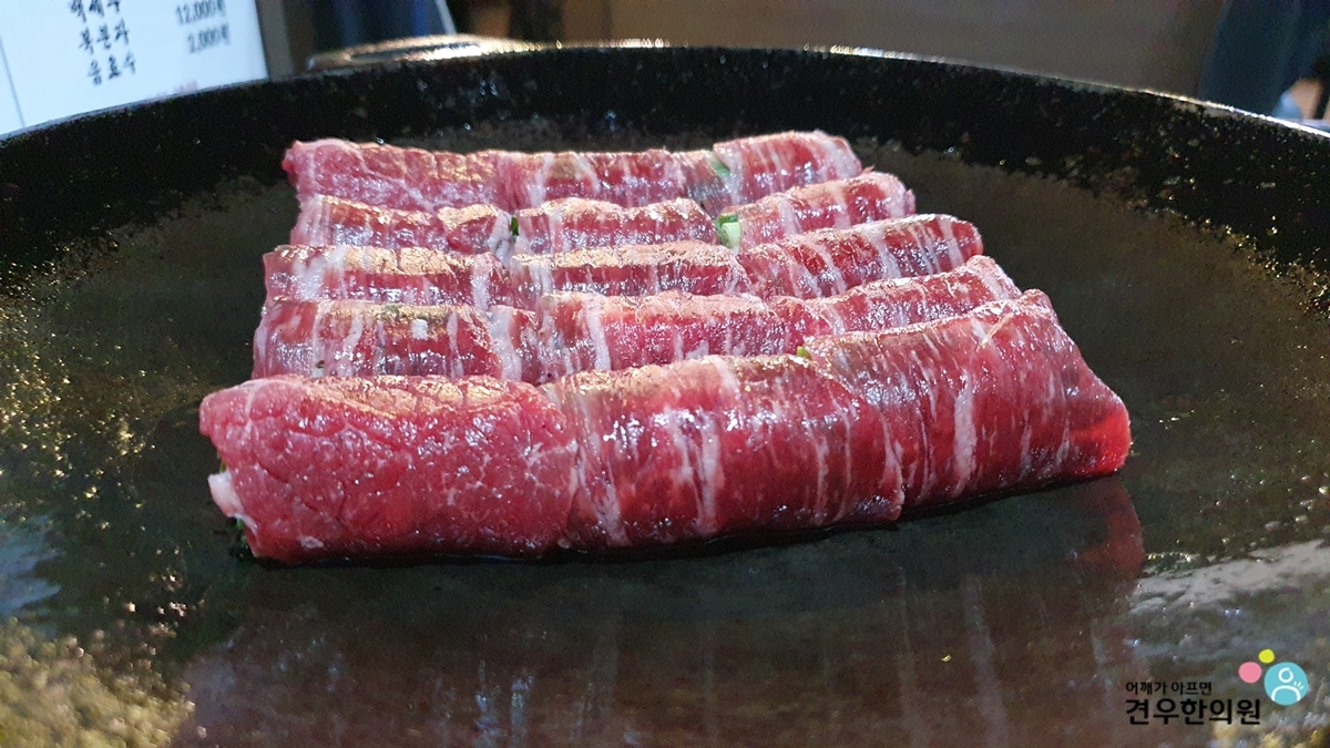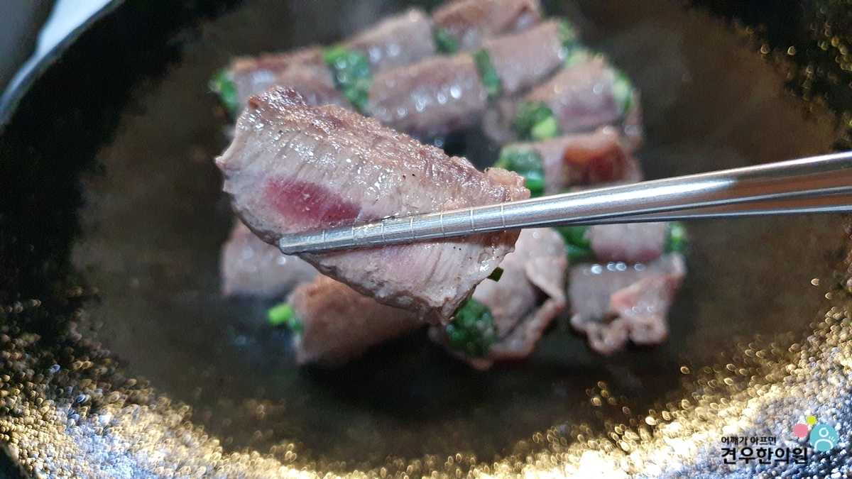 한우를 얇게 썰어 살짝살짝 구운 다음