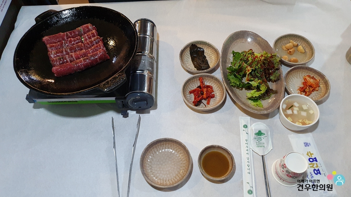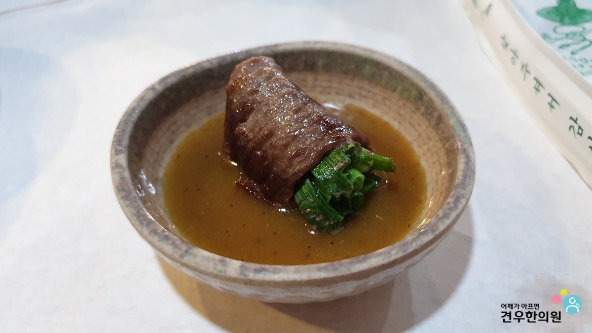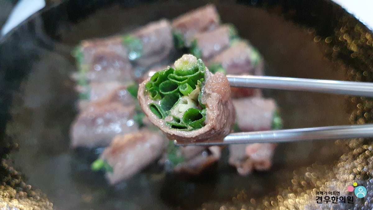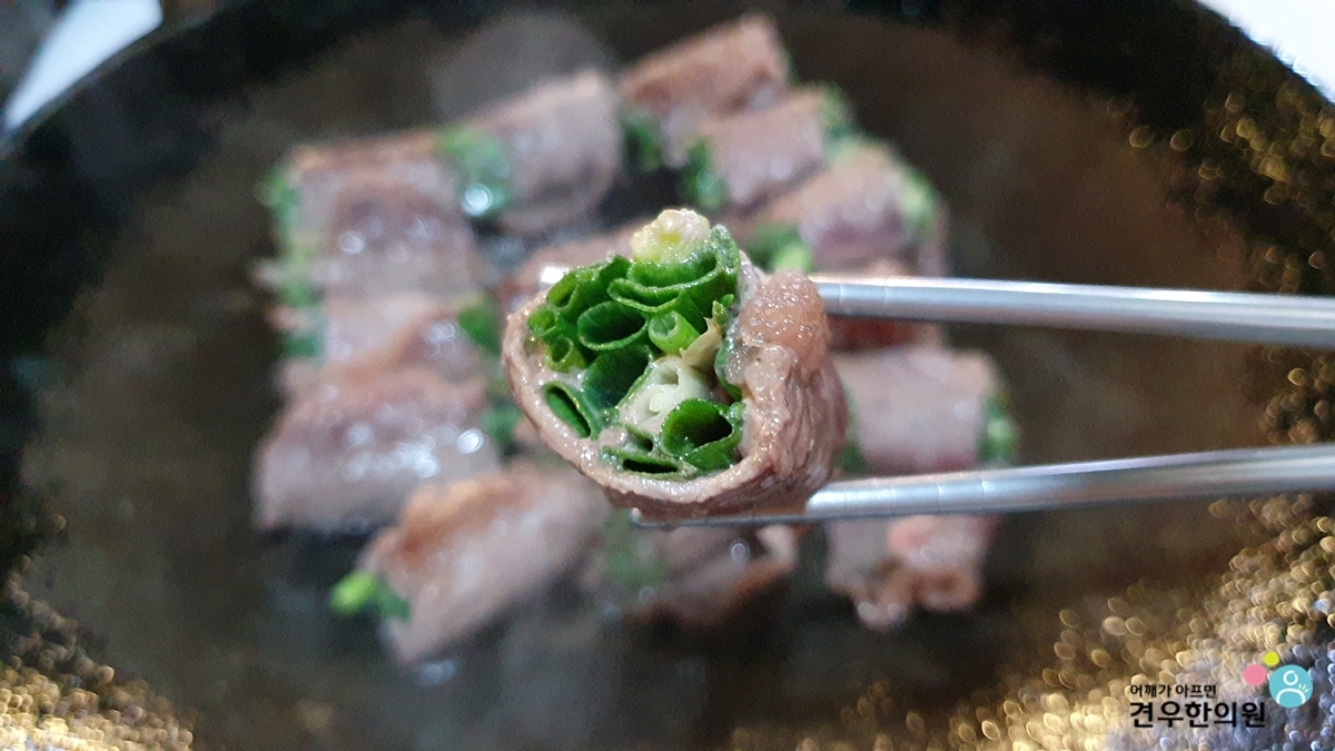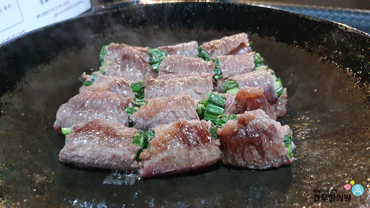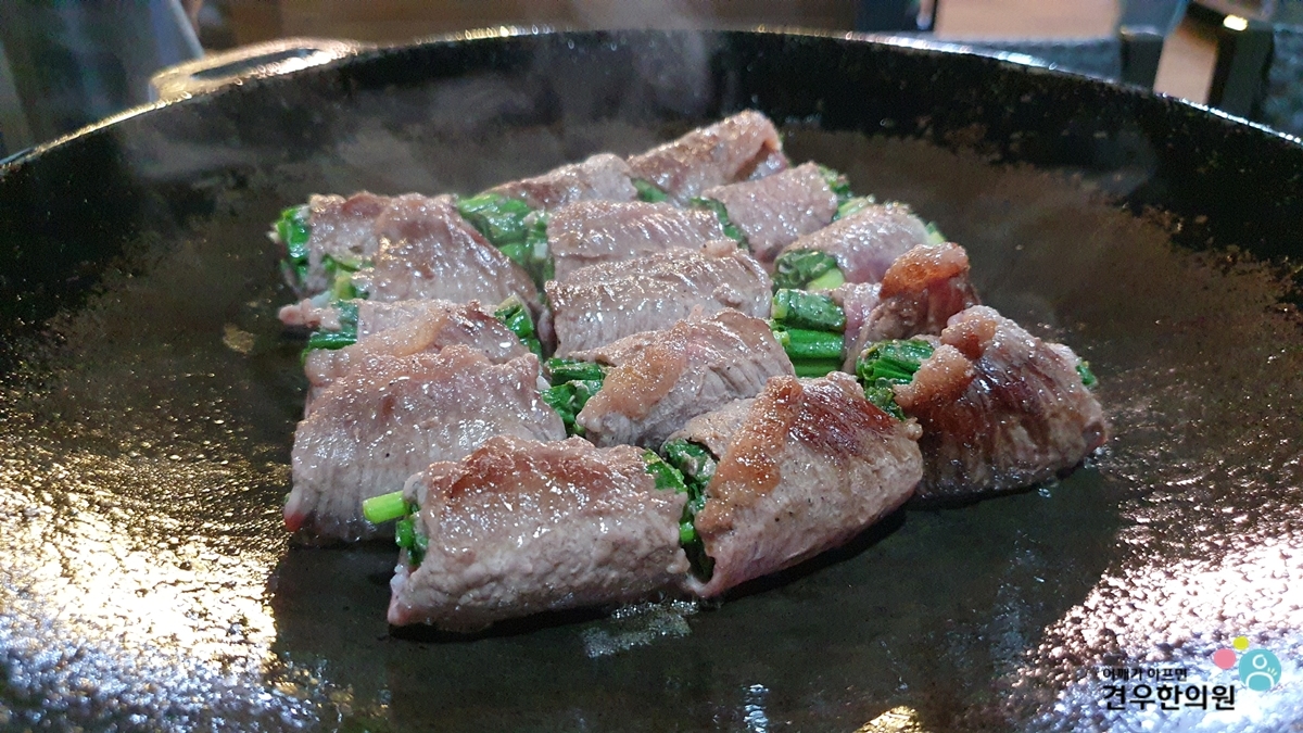 한우를 얇게 썰어 살짝살짝 구운 다음