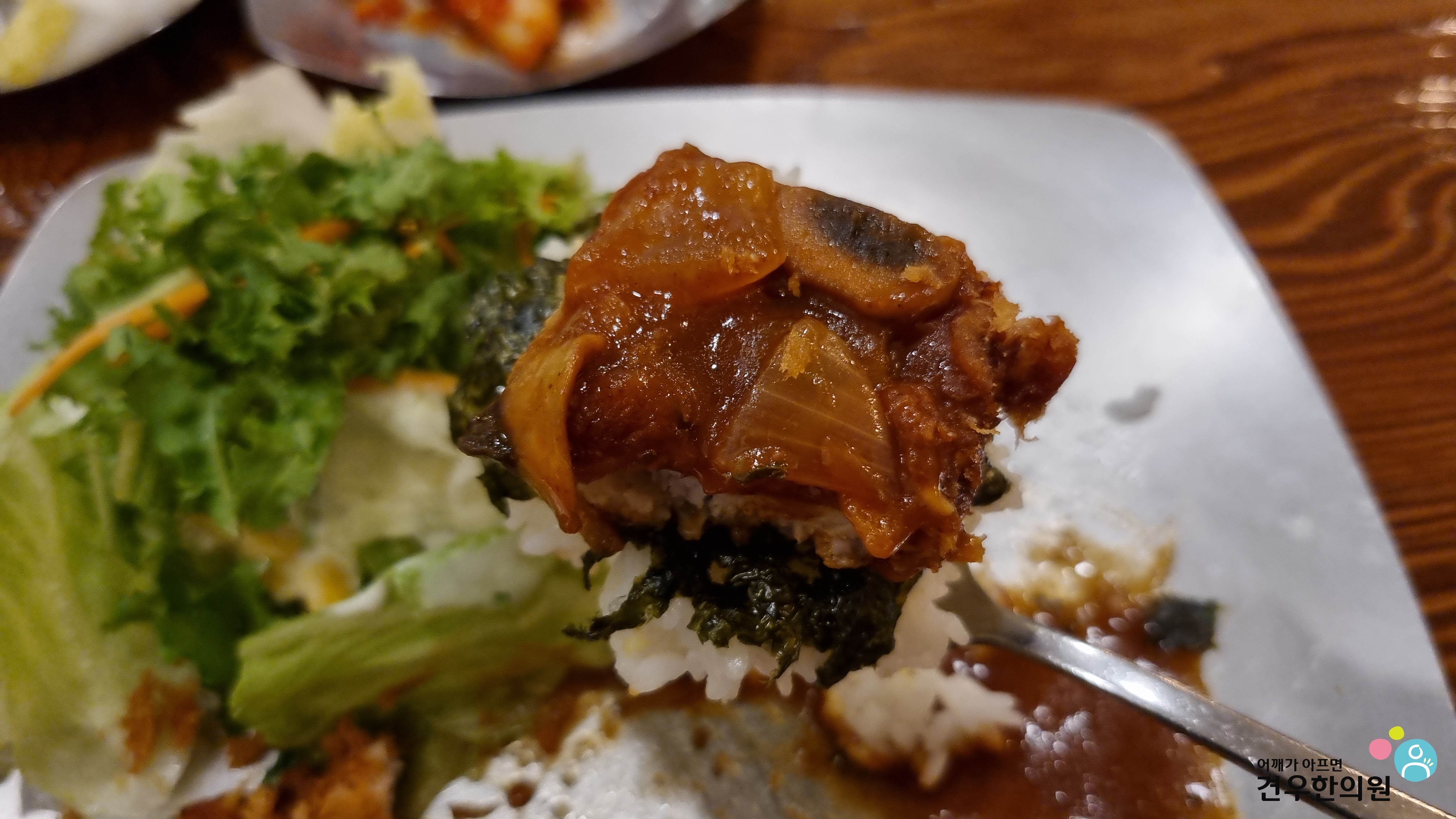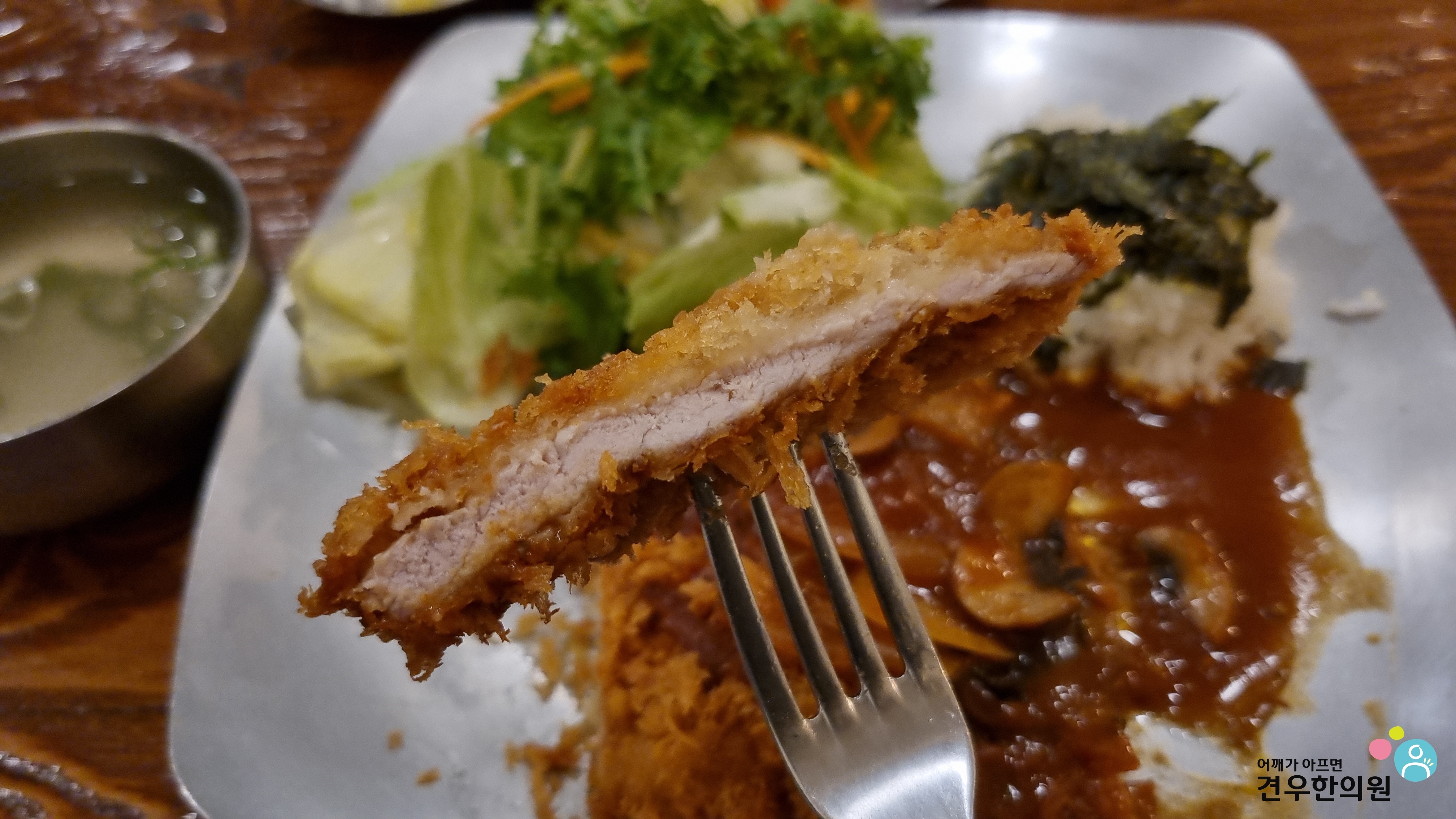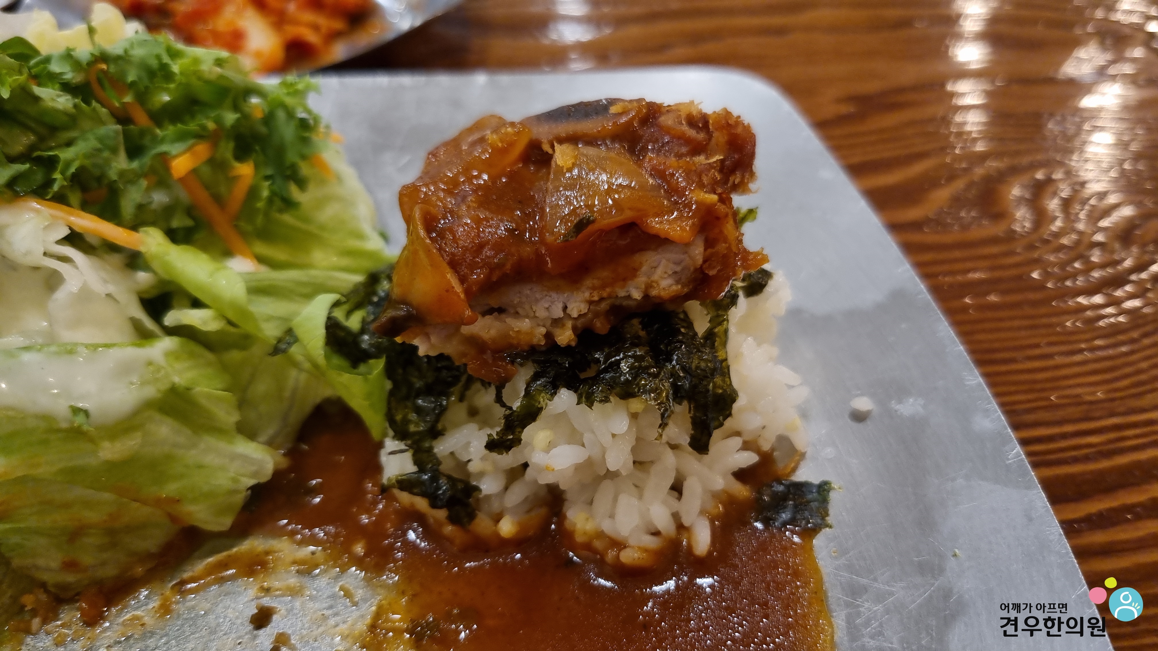 돈까스를 샐러드에 살짝 올리면