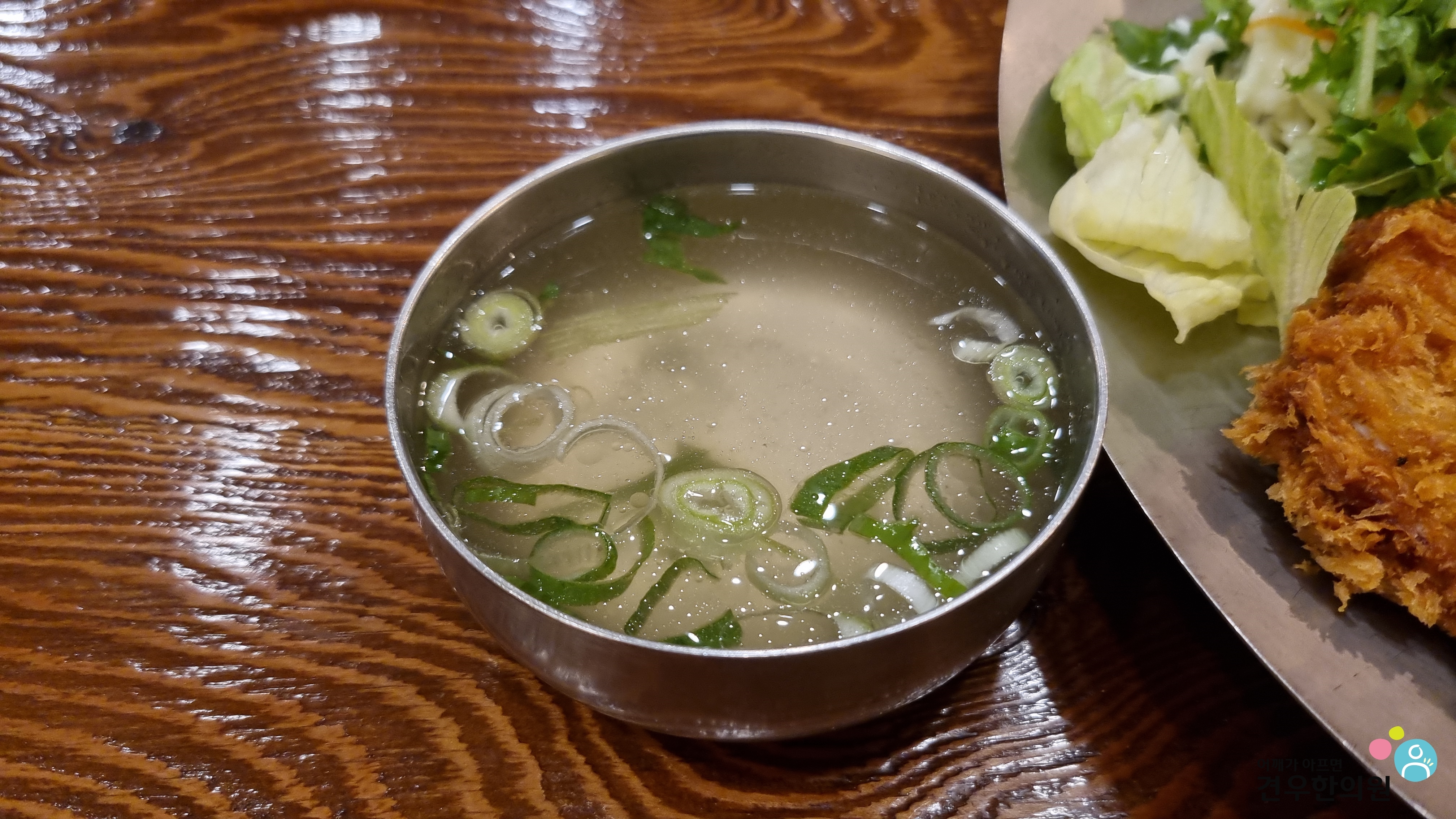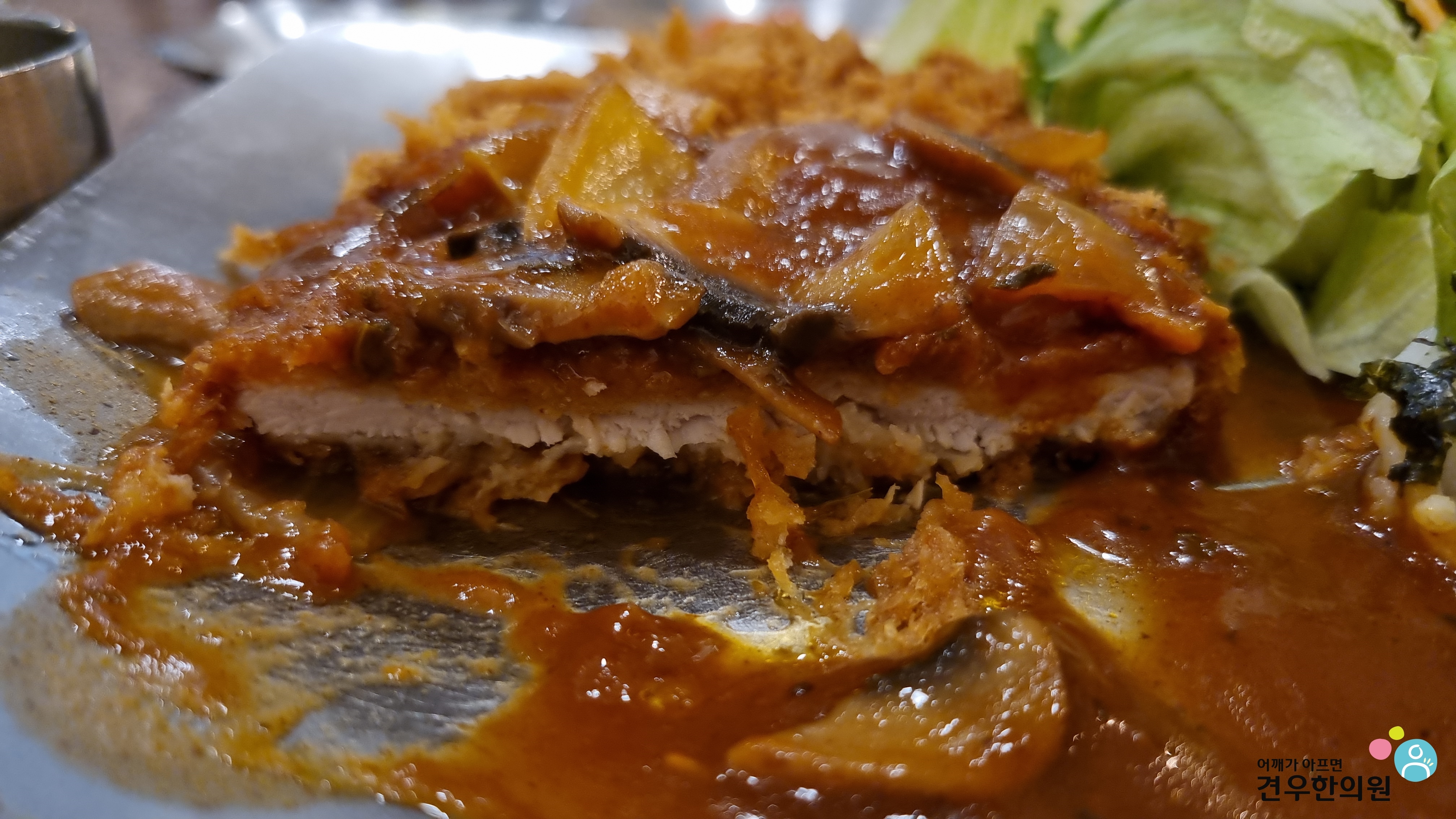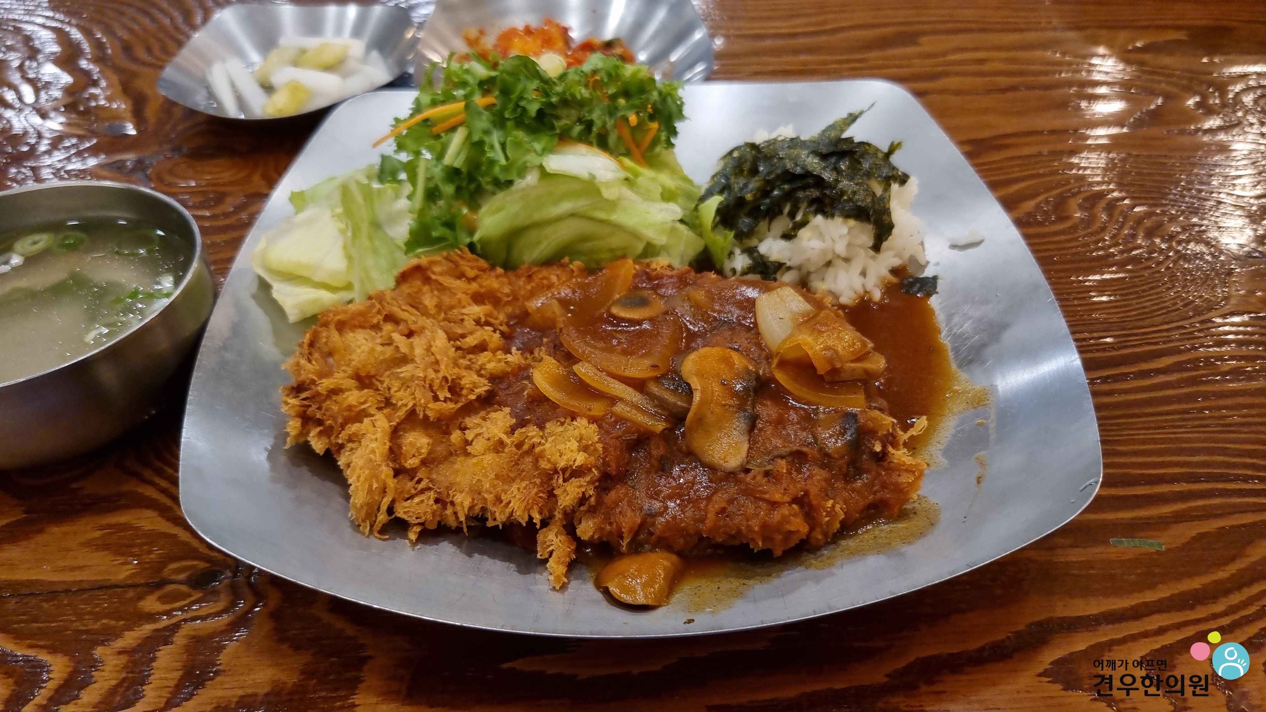 돈까스를 샐러드에 살짝 올리면