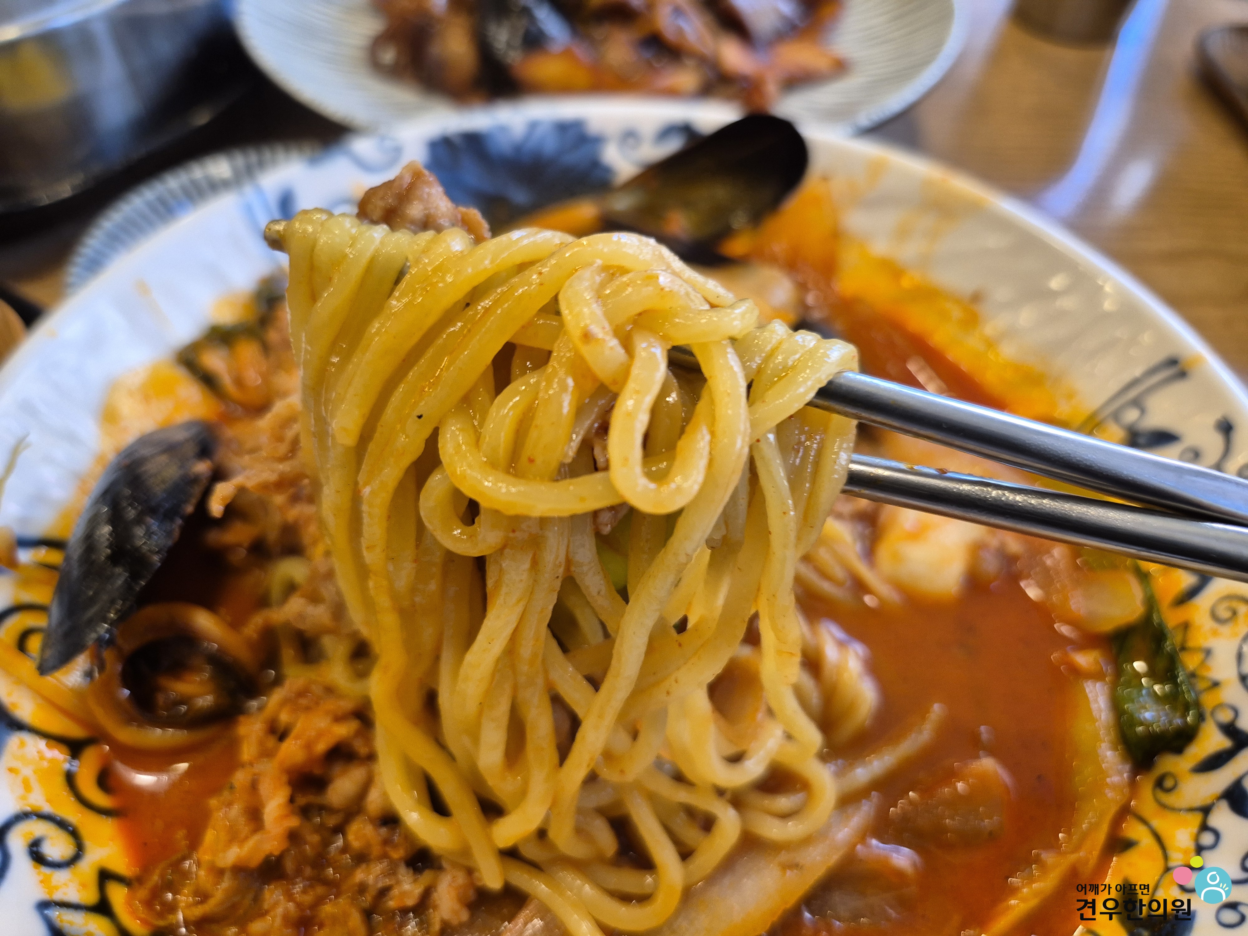 고추기름이 들어가 매콤하면서도 해물(홍합, 오징어, 새우, 주꾸미)이 풍성하게 들어가 감칠맛이 폭발합니다.
