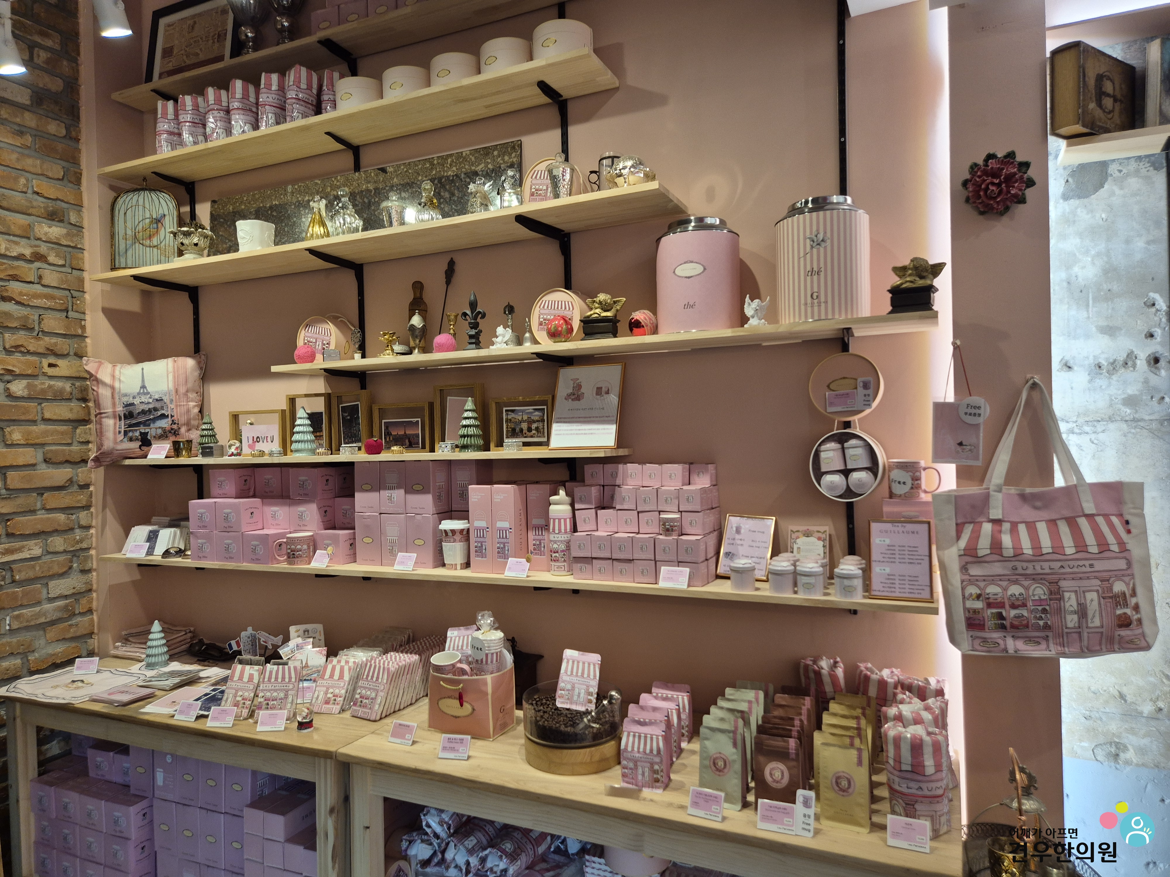 명동카페 한쪽 벽면에는 핑크 빛깔의 다양한 굿즈들도 진열되어 있어 구경하는 재미가 쏠쏠합니다.