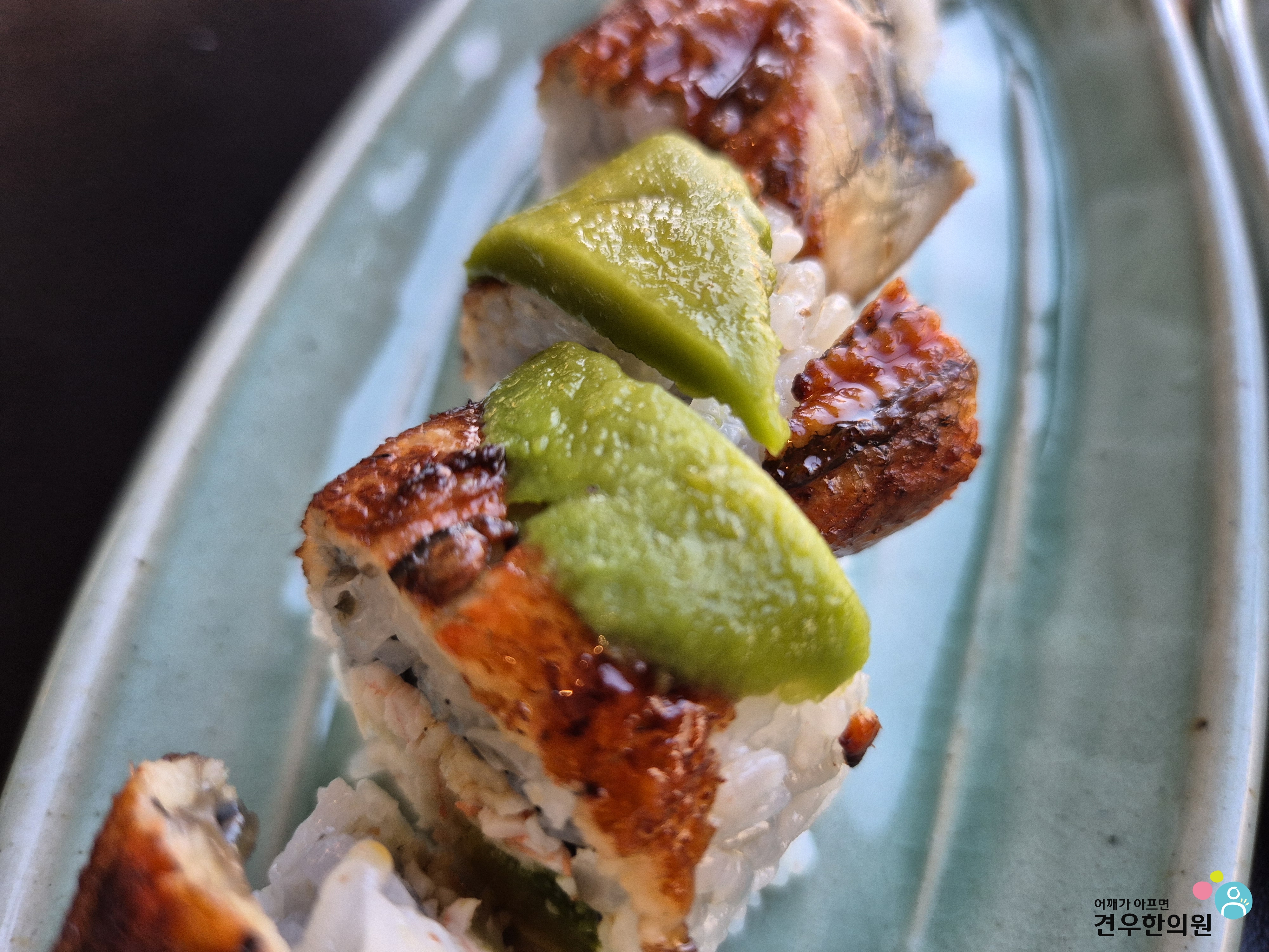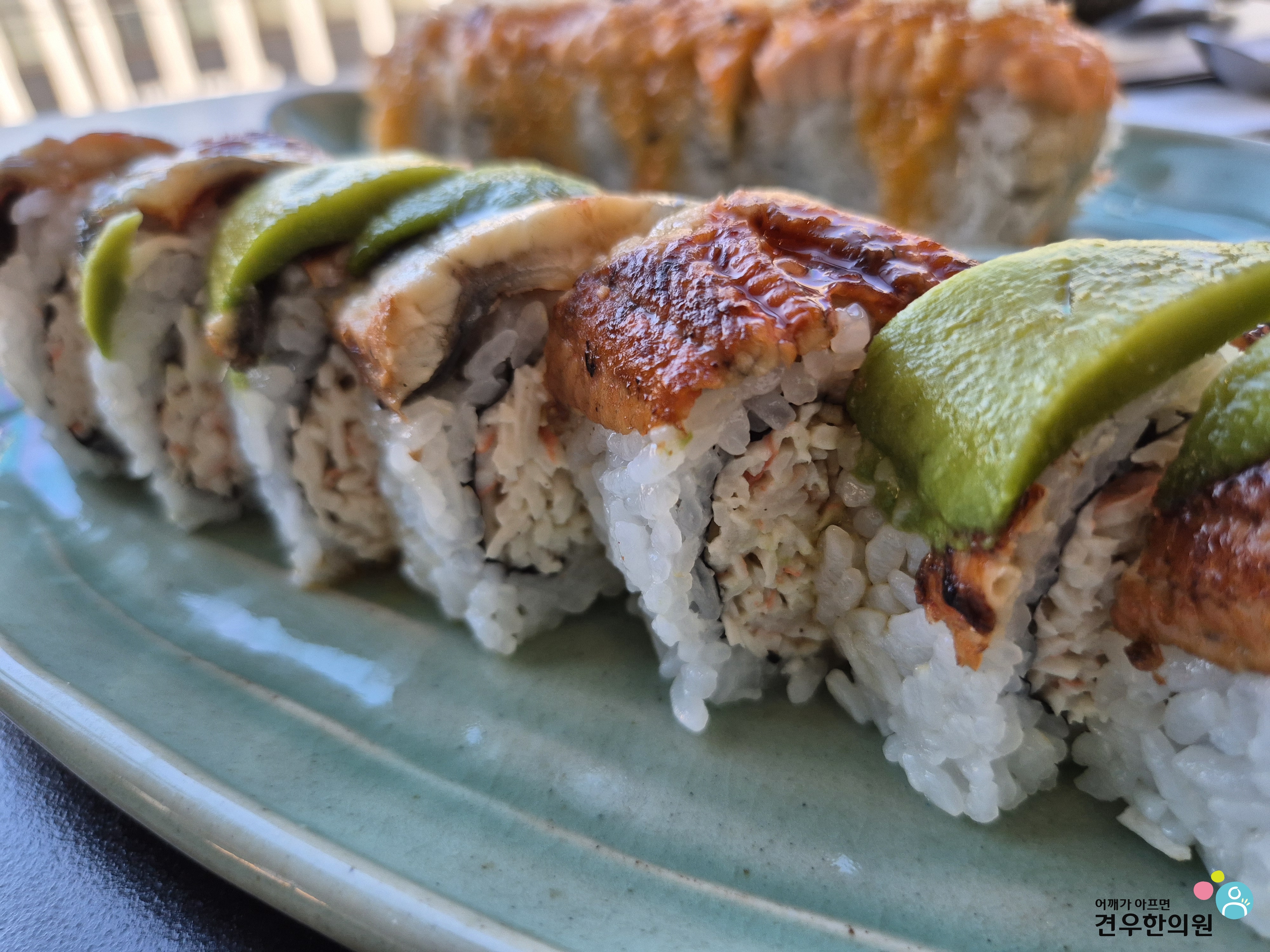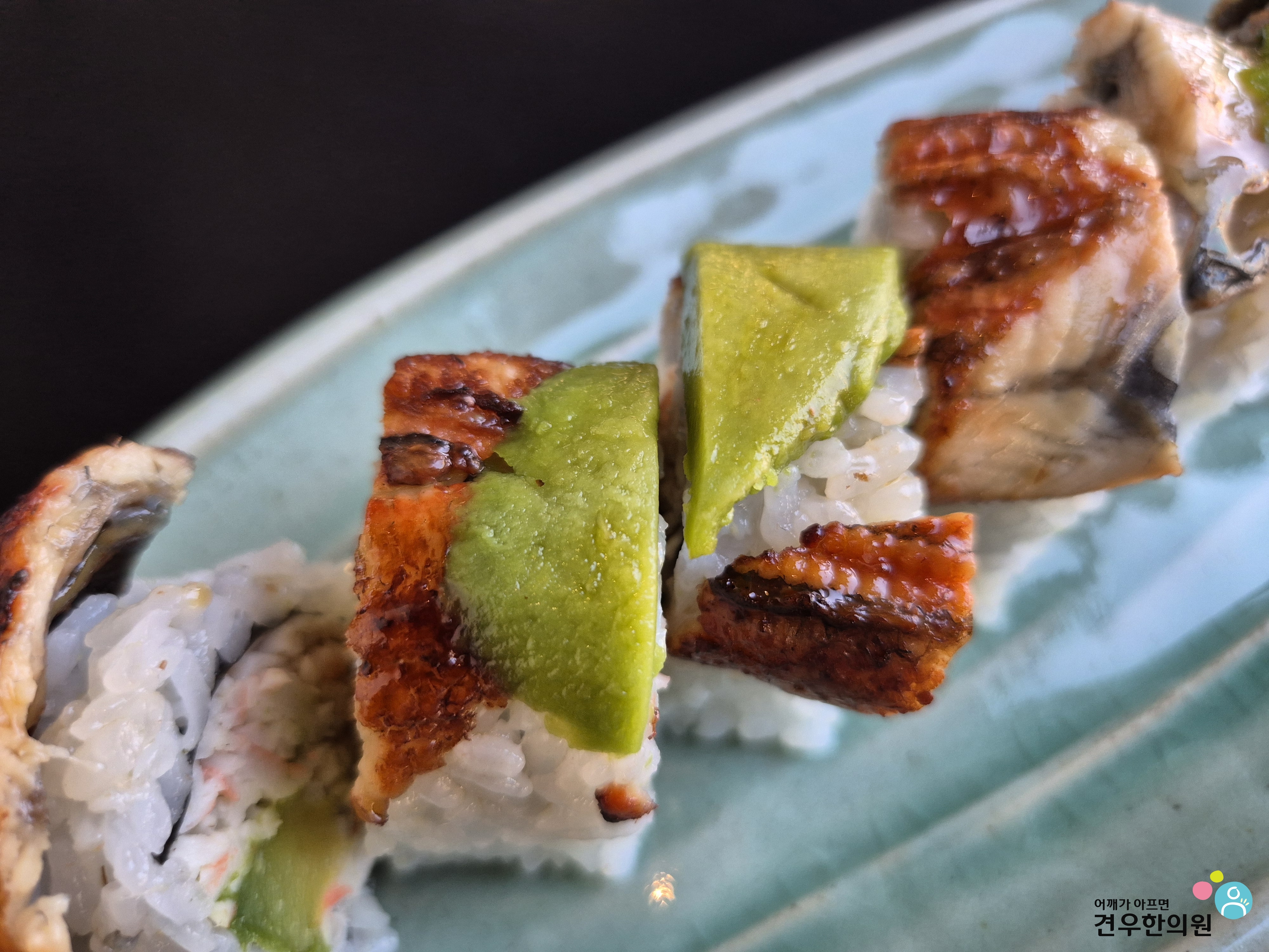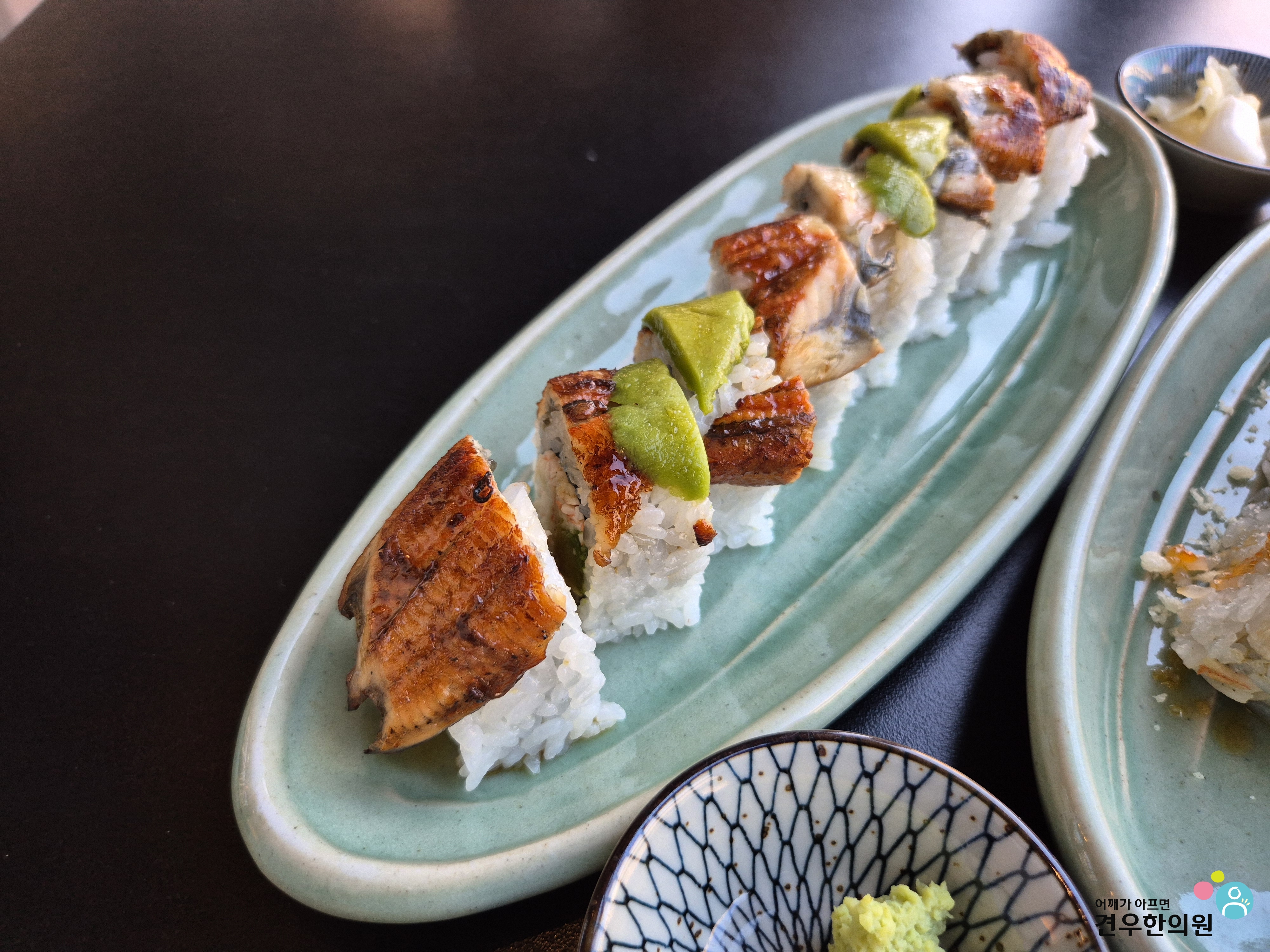 아보카도가 장어 위를 덮고 있는 모습이 마치 '용의 비늘' 같다고 해서 붙여진 이름인데, 정말 이름값 제대로 하는 메뉴입니다. 😊