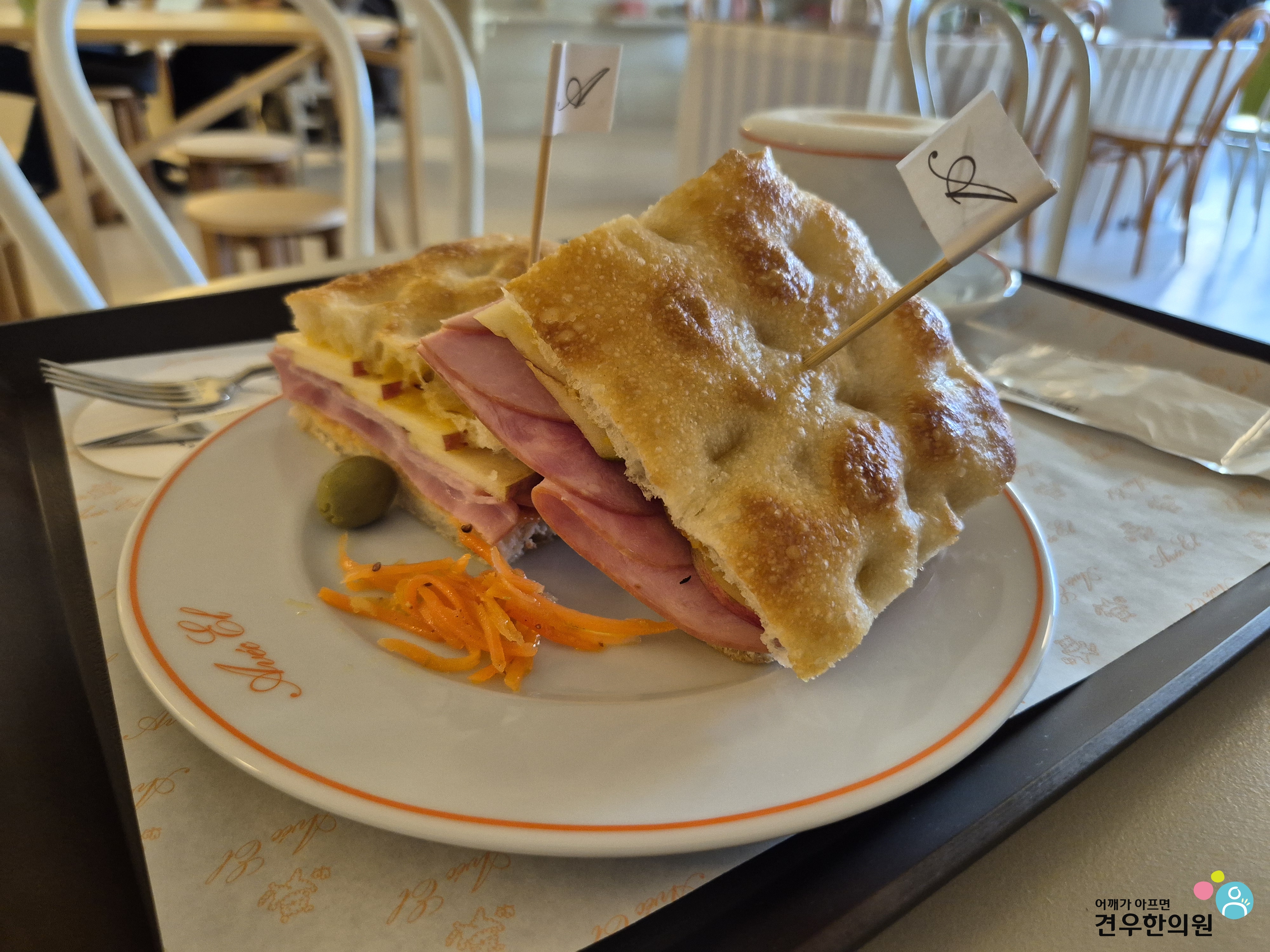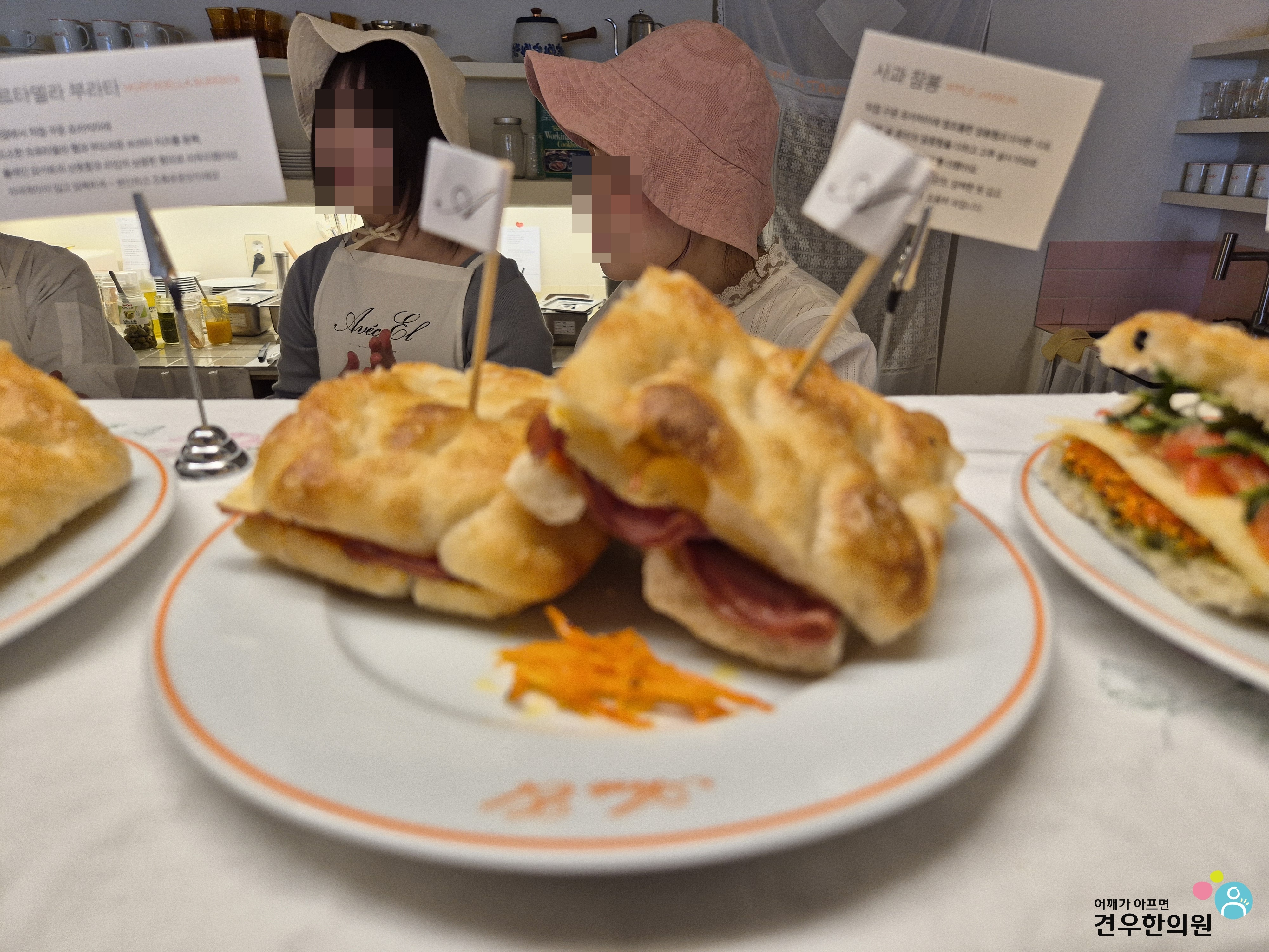 식감의 재미: 겉은 바삭하고 속은 쫄깃한 포카치아를 사용하여 씹는 맛이 일품입니다.