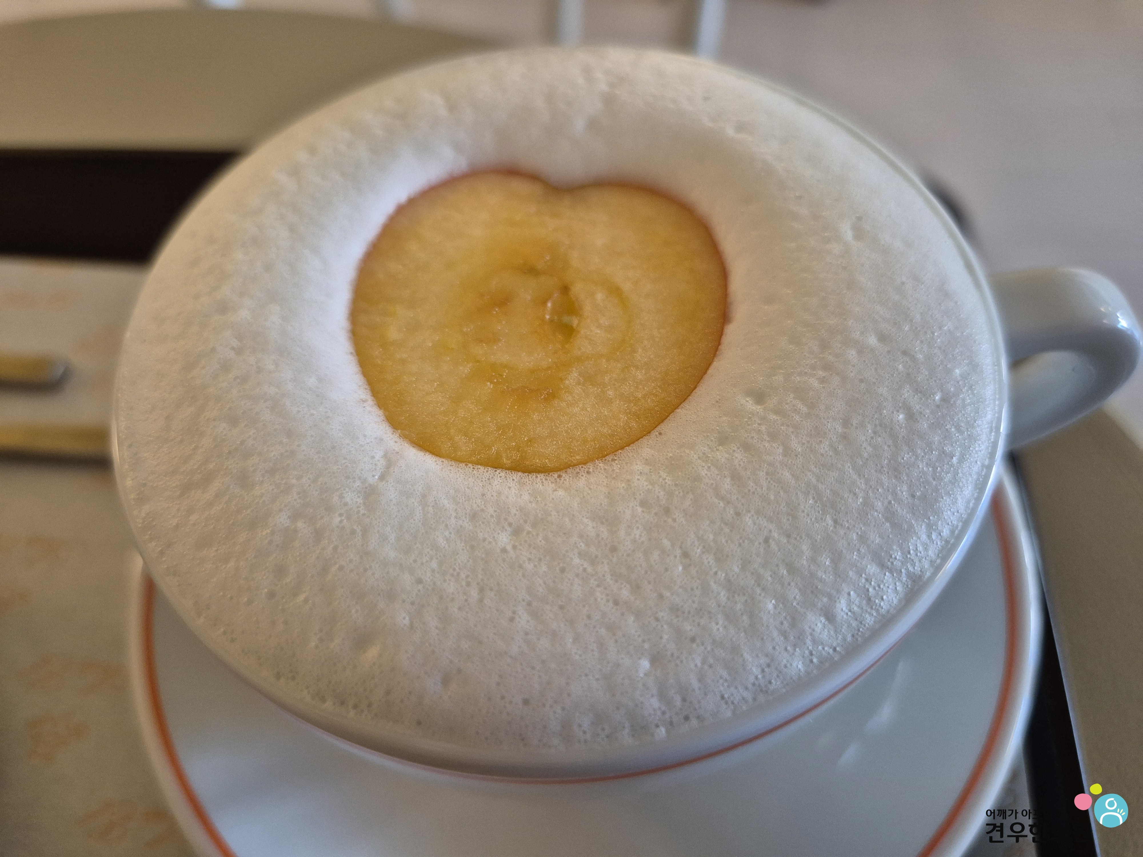 몽글몽글하고 촘촘한 우유 거품 위에 아주 작은 '알프스 오토메(미니 사과)' 한 알이 톡 올라가 있습니다.