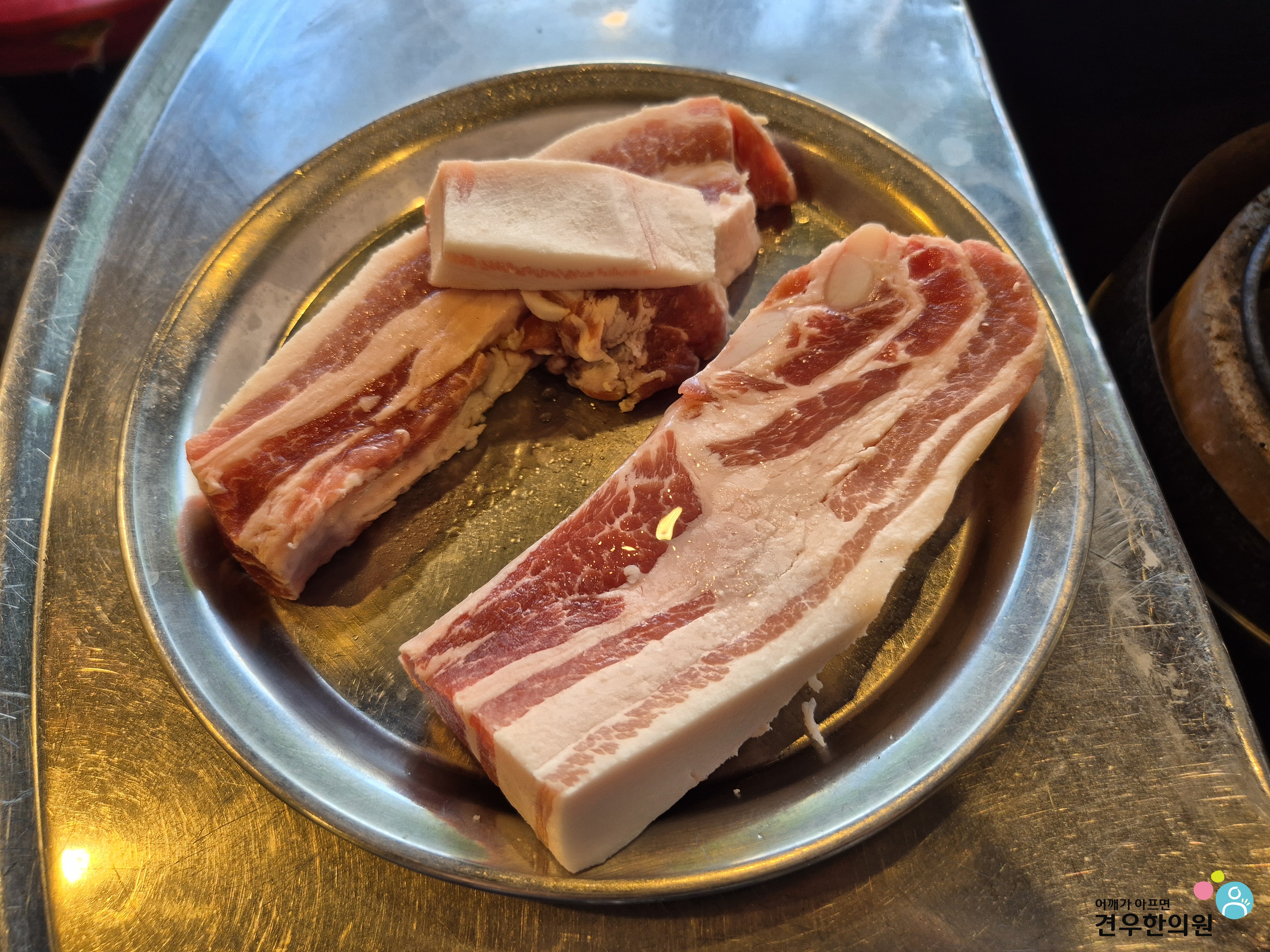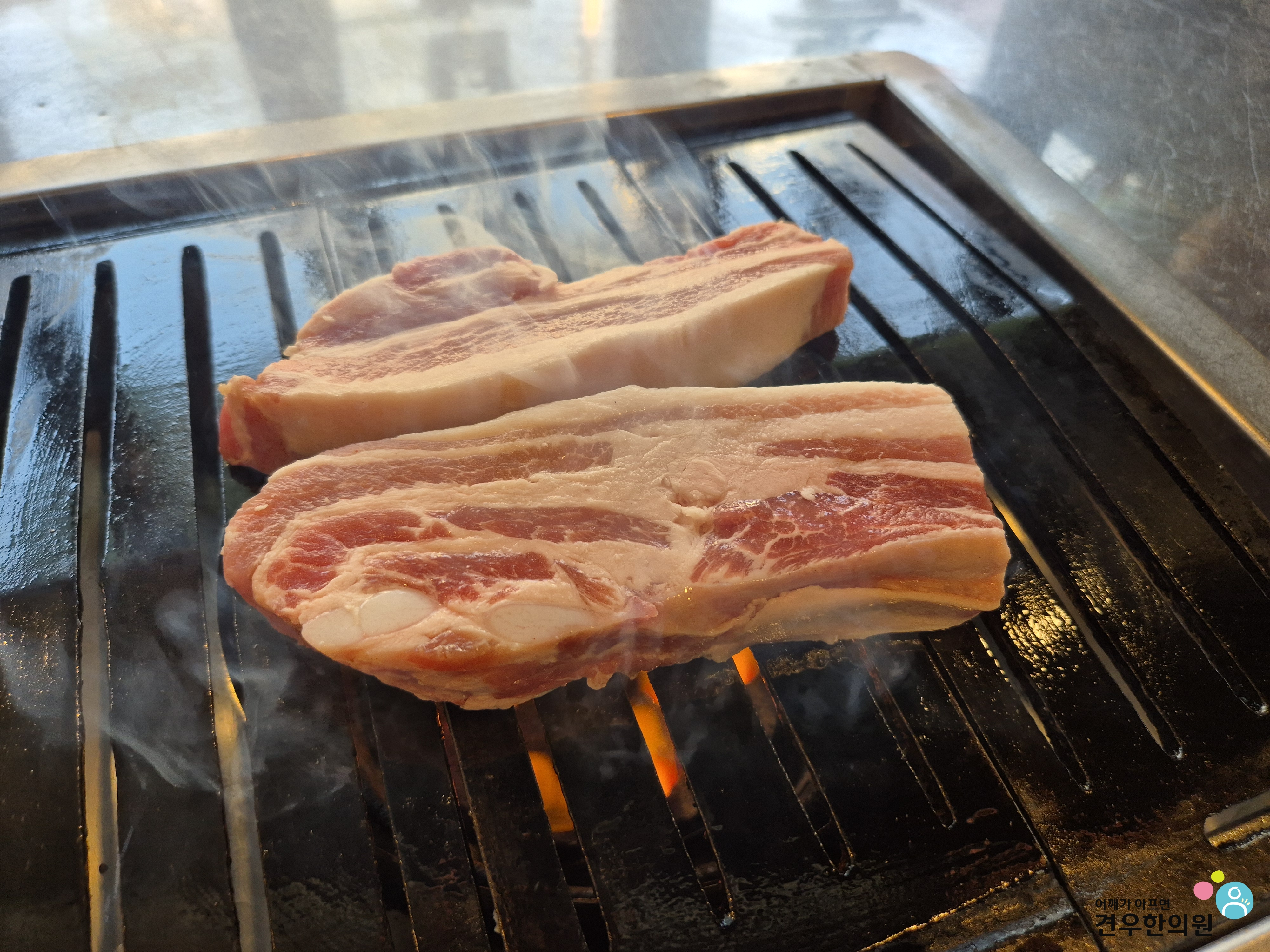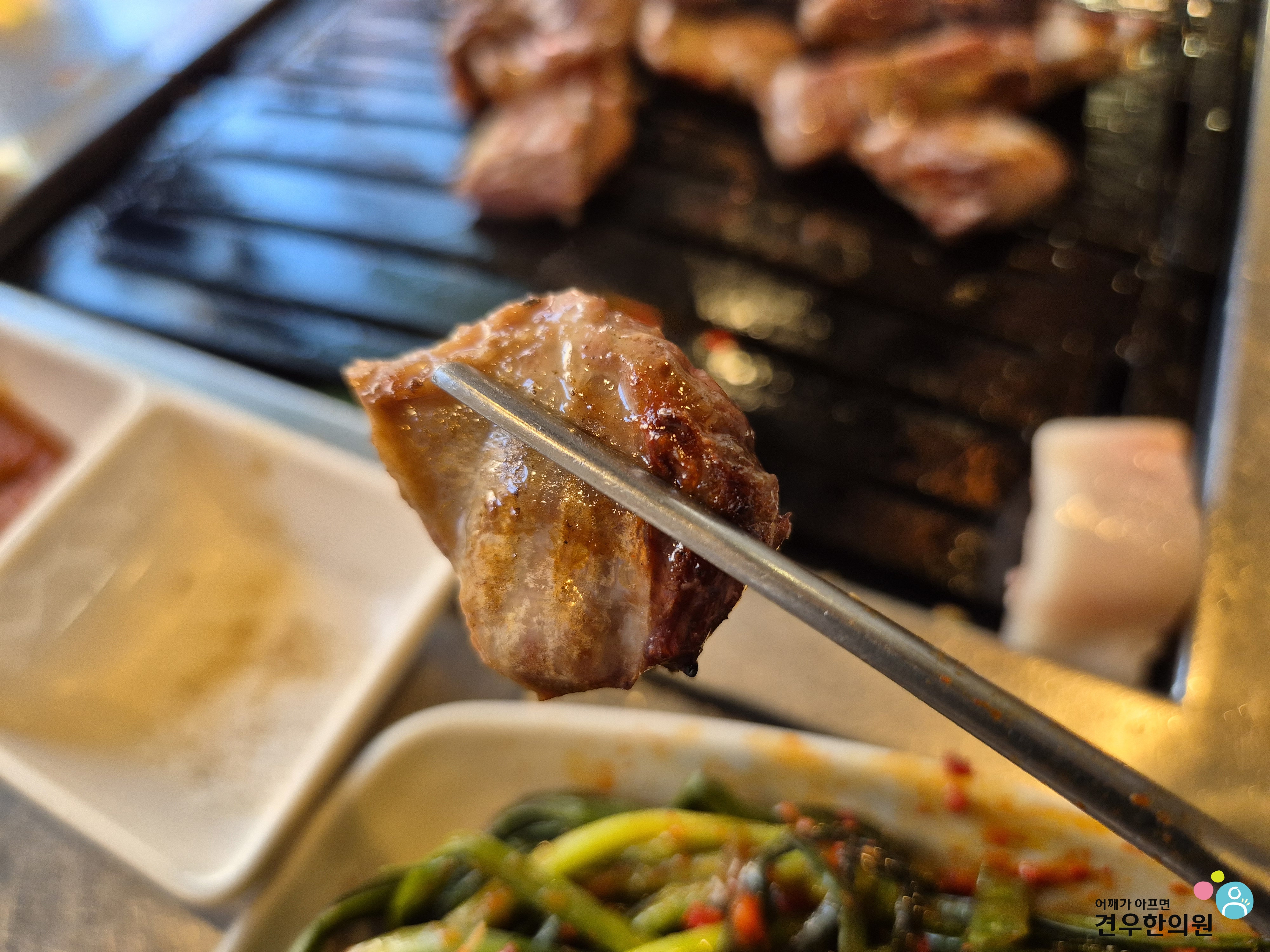 요즘 유행하는 얇은 냉삼 스타일이 아니라, 연탄불의 강한 화력을 견뎌낼 수 있는 **'스테이크급 두께'**를 자랑합니다. 🥩
