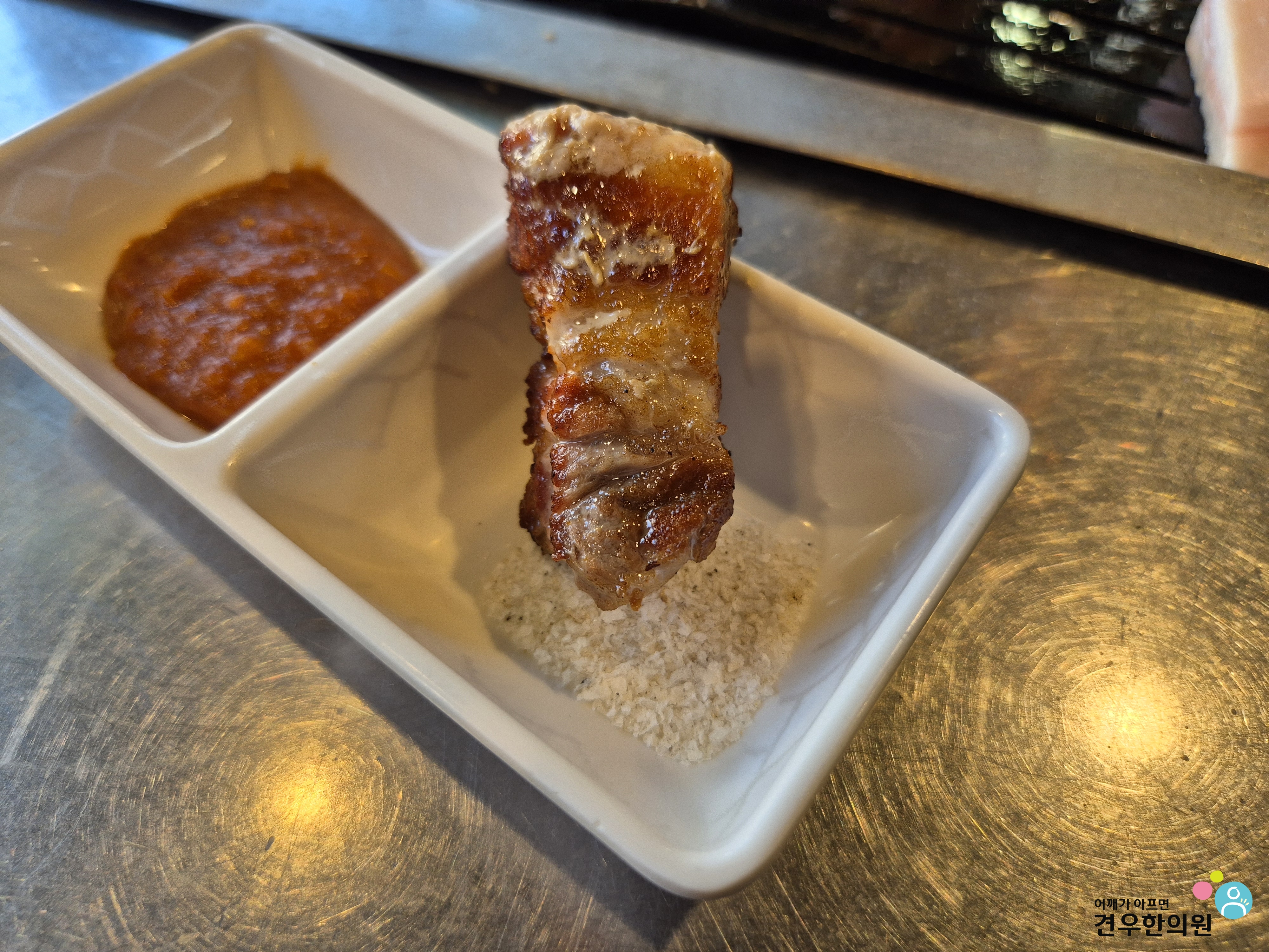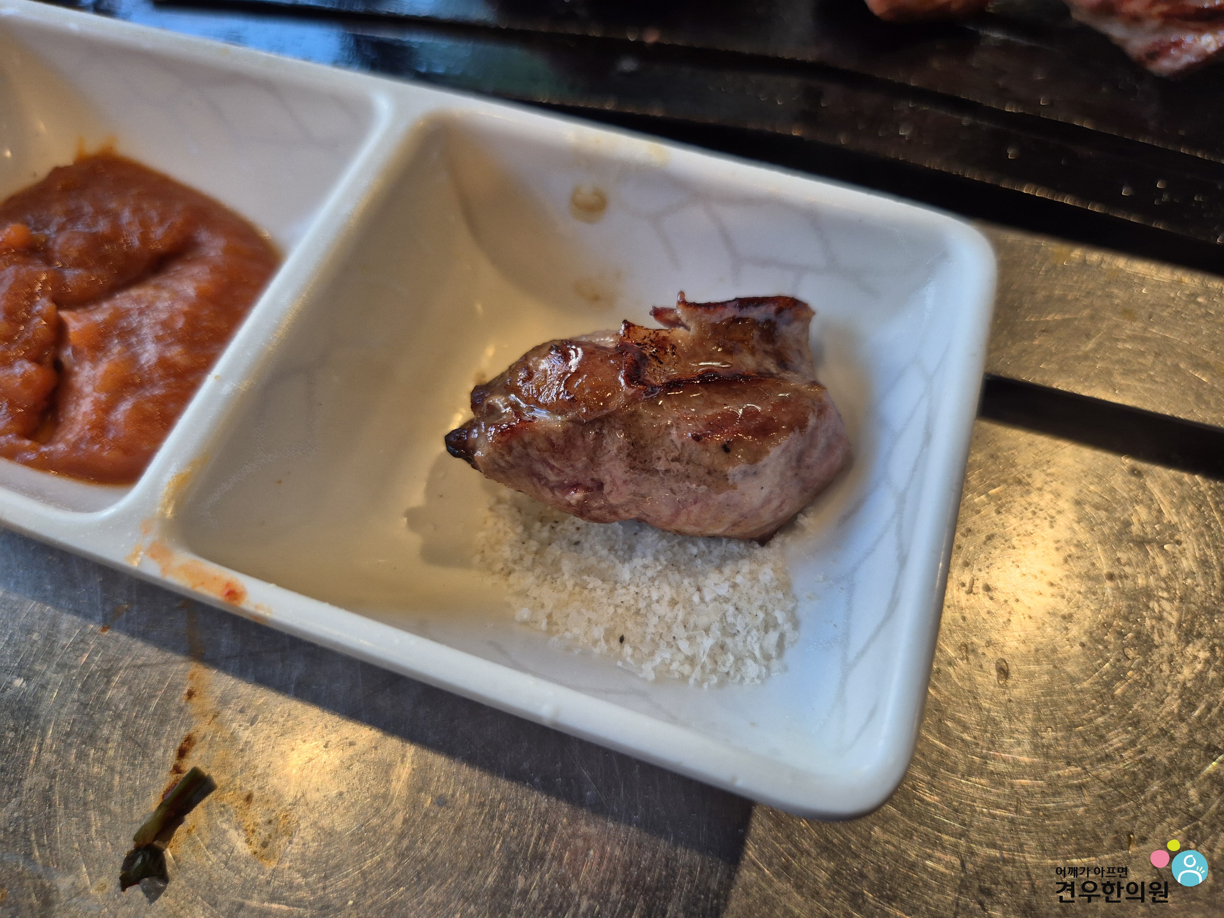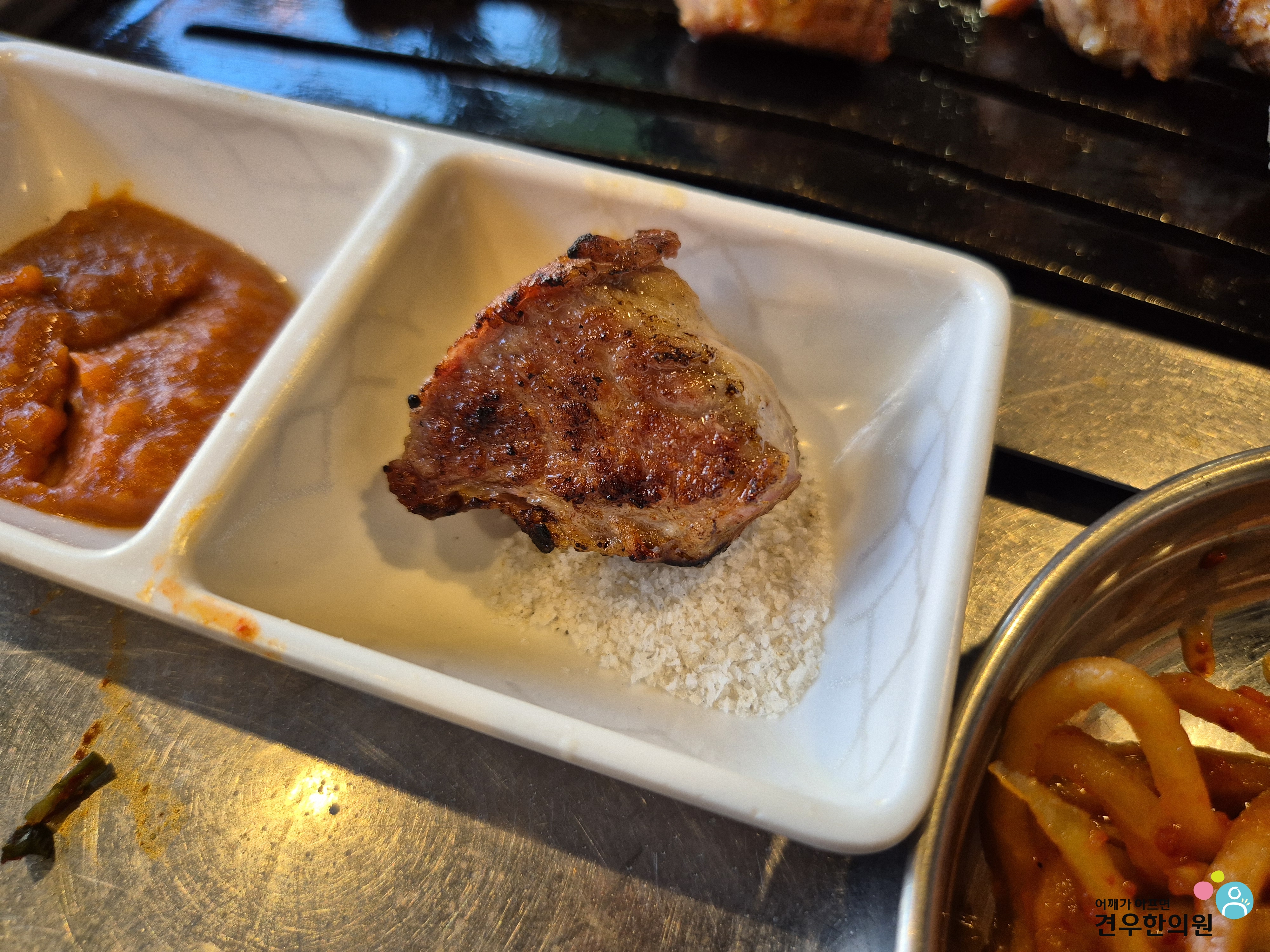 첫 점은 양념 없이 소금만 살짝 찍어 고기 본연의 맛을 느껴보시길 추천합니다! 👍