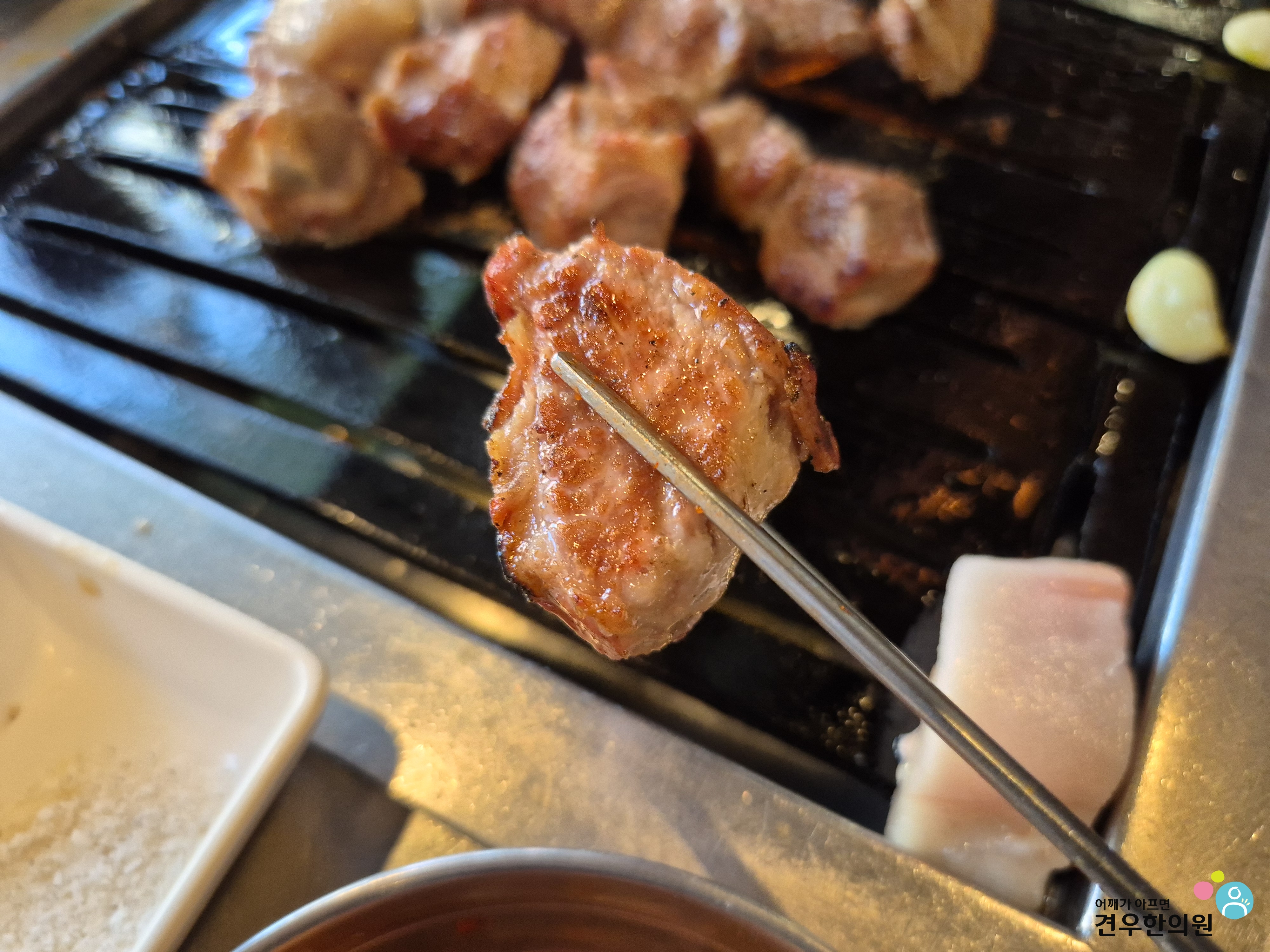 굴려가며 굽다 보면 소고기 토시살을 먹는 듯한 착각이 들 정도로 육향이 진합니다.