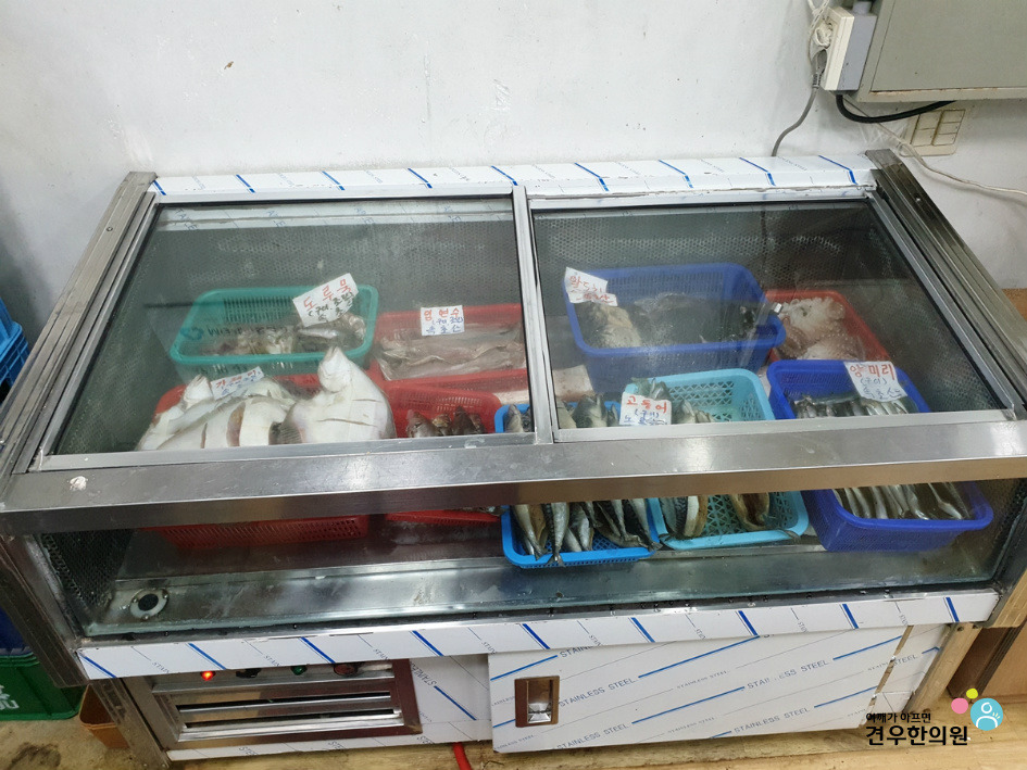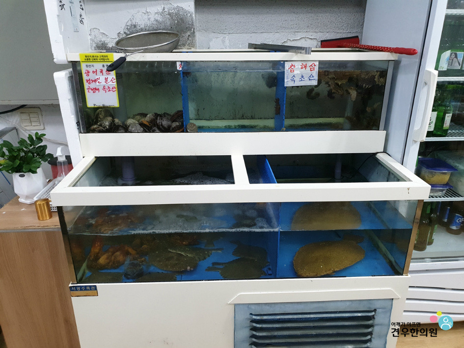 생선 냉장고와 수족관이 보입니다.