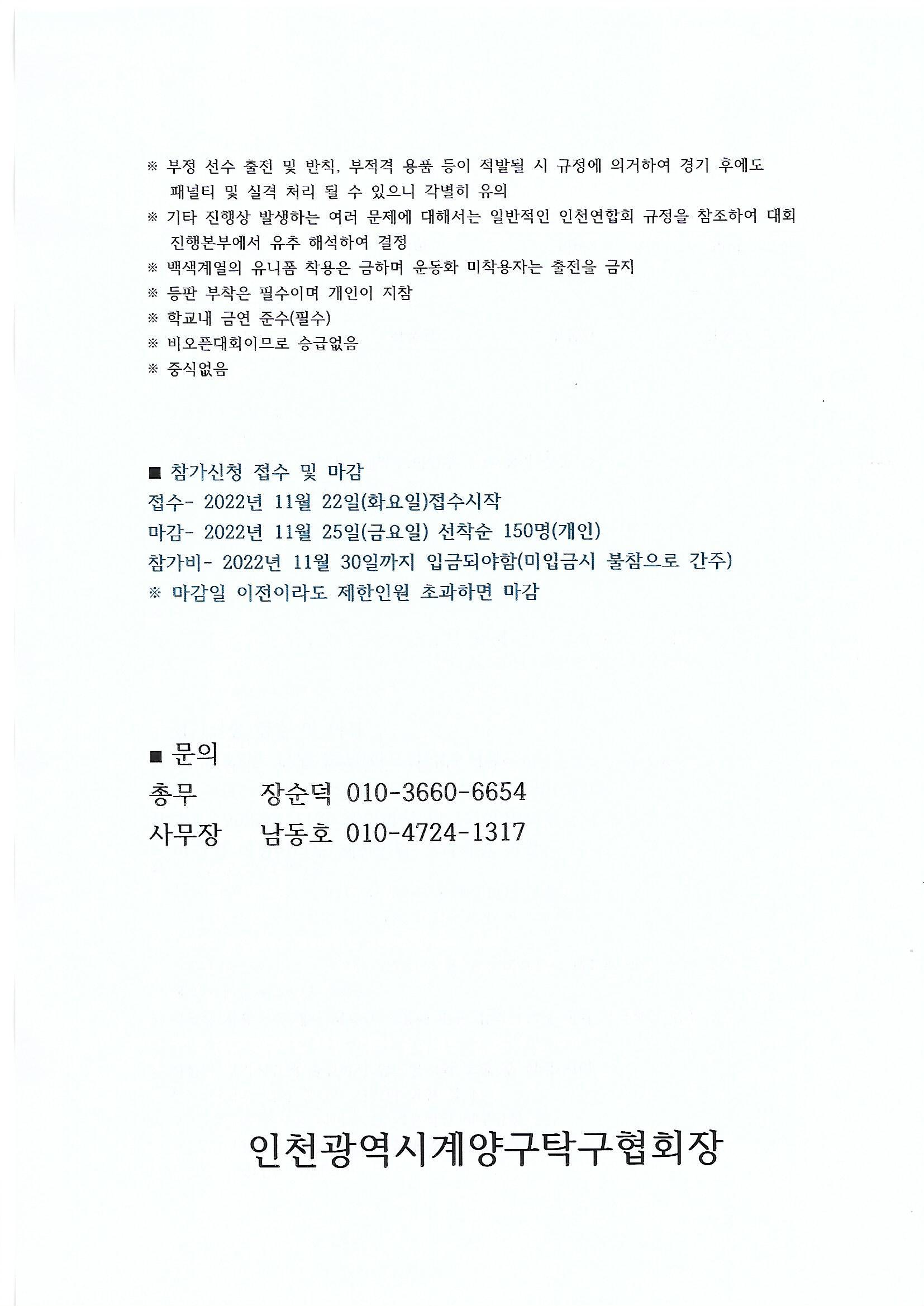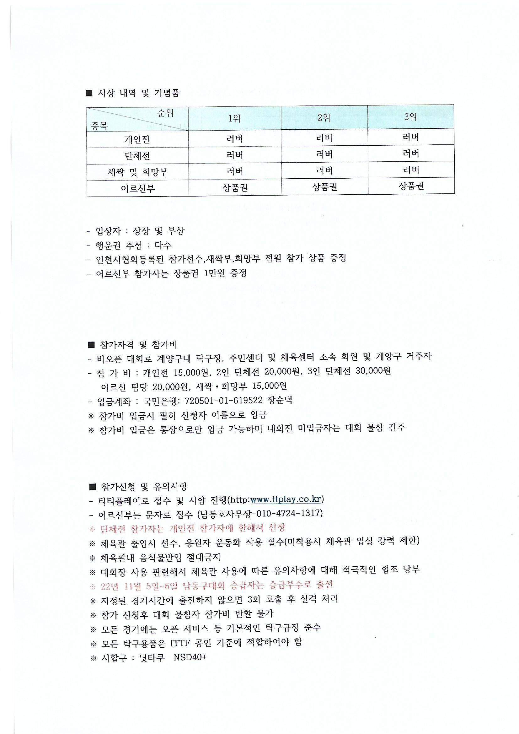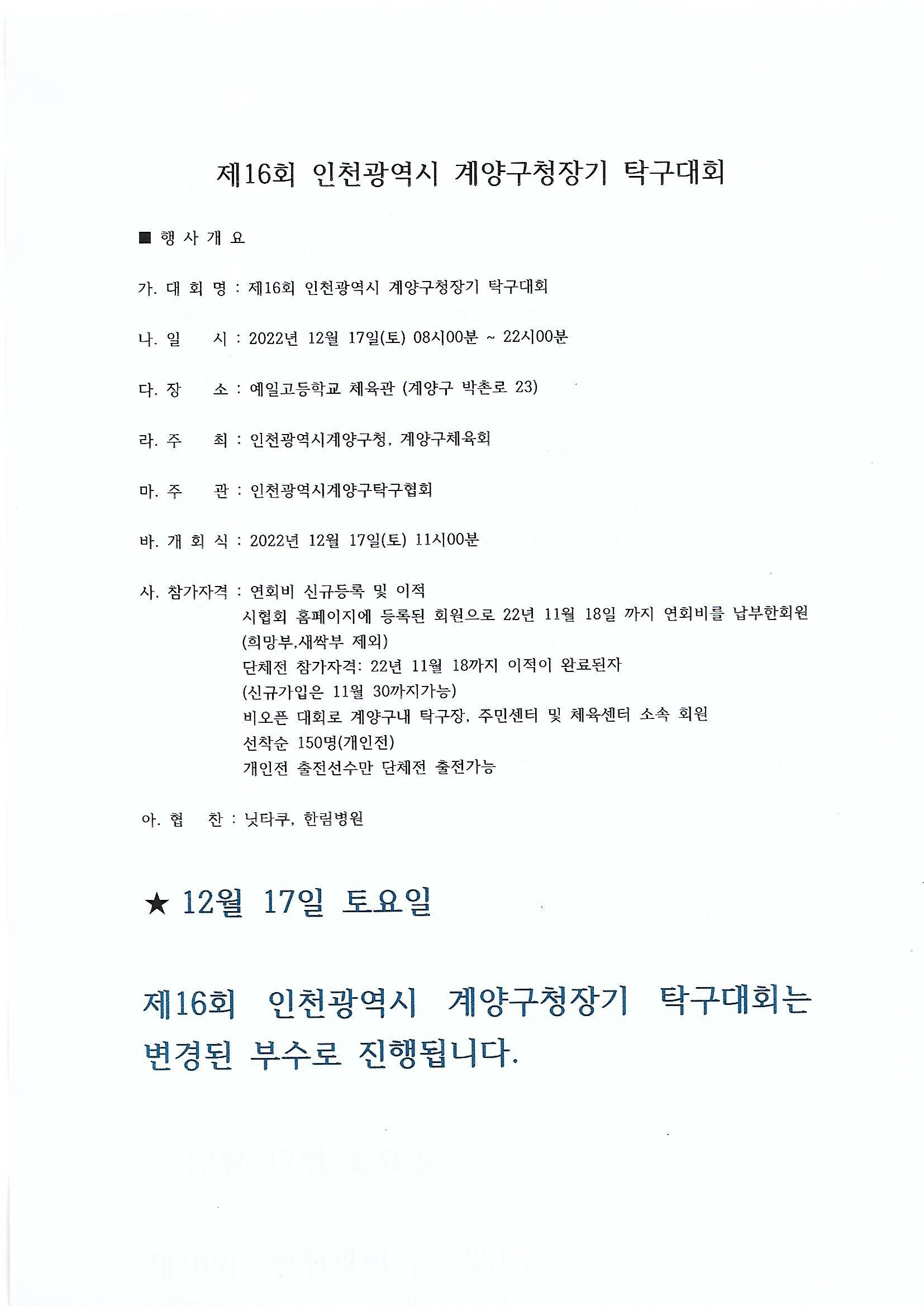 제16회 인천광역시 계양구청장기 탁구대회 요강 수정(비오픈)날짜변경 작성자남동호|작성시간22.11.07|조회수352 목록 댓글 0 글자크기 작게가 글자크기 크게가 다음검색 현재 게시글 추가 기능 열기 북마크 공유하기 신고 센터로 신고 댓글 댓글 0 댓글쓰기 답글쓰기 댓글 리스트