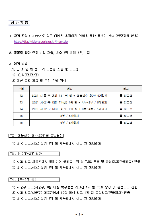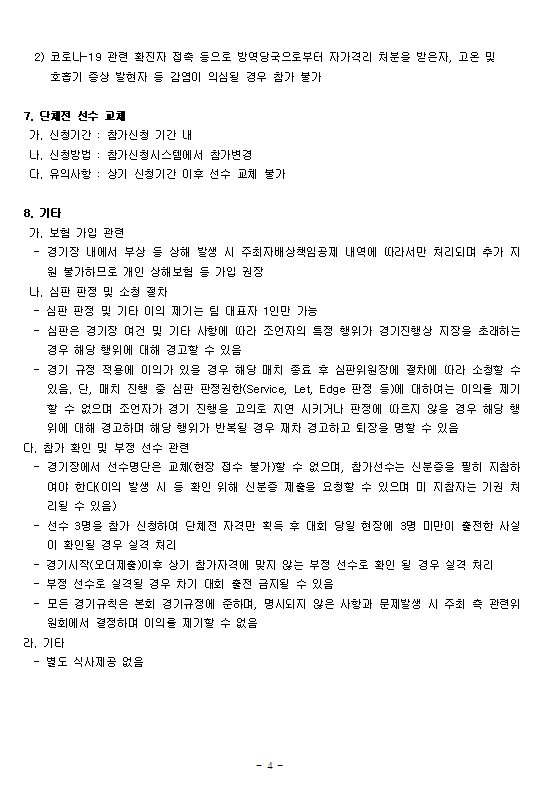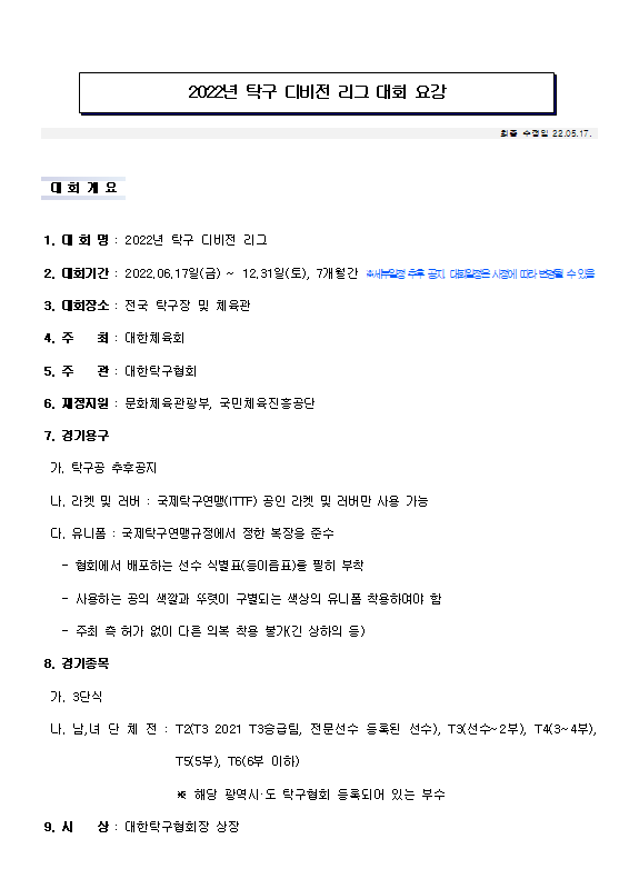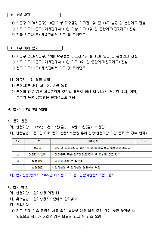 2022 디비전 요강 작성자남동호|작성시간22.06.08|조회수111 목록 댓글 0 글자크기 작게가 글자크기 크게가 2022 탁구 디비전 규정 제정 2.hwp44.00KB 첨부파일첨부된 파일이 5개 있습니다. png 파일 3.png 다운로드 png 파일 2.png 다운로드 png 파일 1.png 다운로드 png 파일 4.png 다운로드 hwp 파일 2022 탁구 디비전 규정 제정 2.hwp 다운로드 다음검색 현재 게시글 추가 기능 열기 북마크 공유하기 신고 센터로 신고 댓글 댓글 0 댓글쓰기 답글쓰기 댓글 리스트