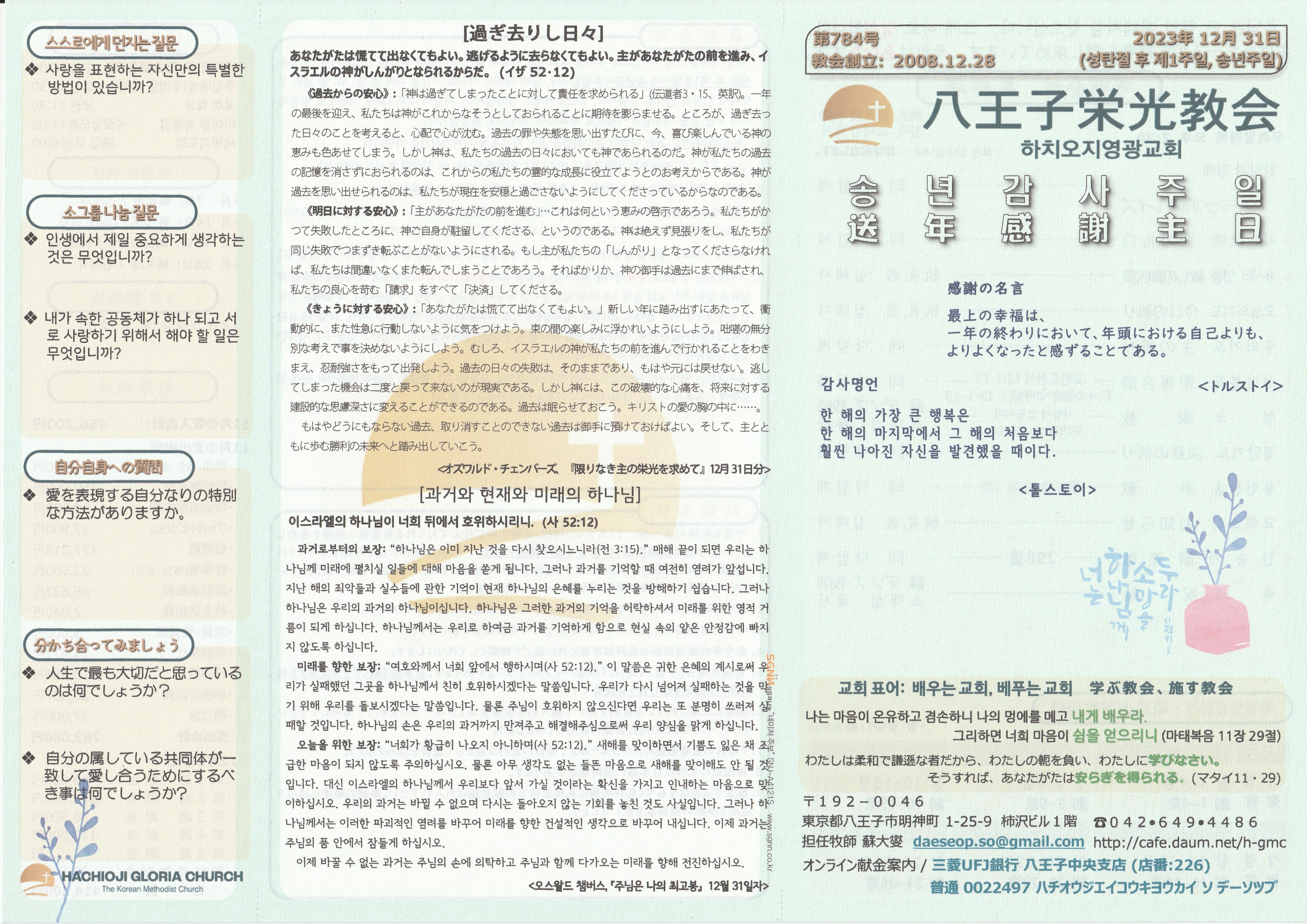 2023년 12월 31일 (성탄절 후 제1주일) 주보 작성자소대섭 목사|작성시간23.12.30|조회수30 목록 댓글 0 글자크기 작게가 글자크기 크게가 다음검색 현재 게시글 추가 기능 열기 북마크 공유하기 신고 센터로 신고 댓글 댓글 0 댓글쓰기 답글쓰기 댓글 리스트