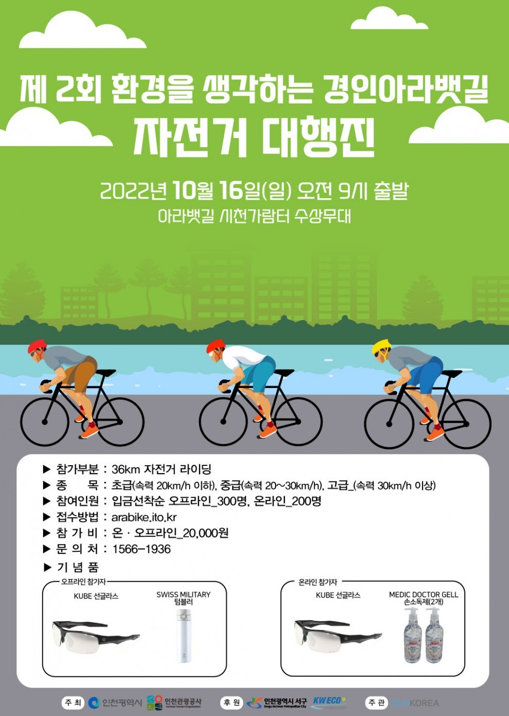 아라뱃길 자전거 대행진 : 10월 16일(일), 검암역 시천가람터, 36km, 오프라인/온라인, 2만원(선착순 500명), 쿠베 썬글라스/텀블러 제공