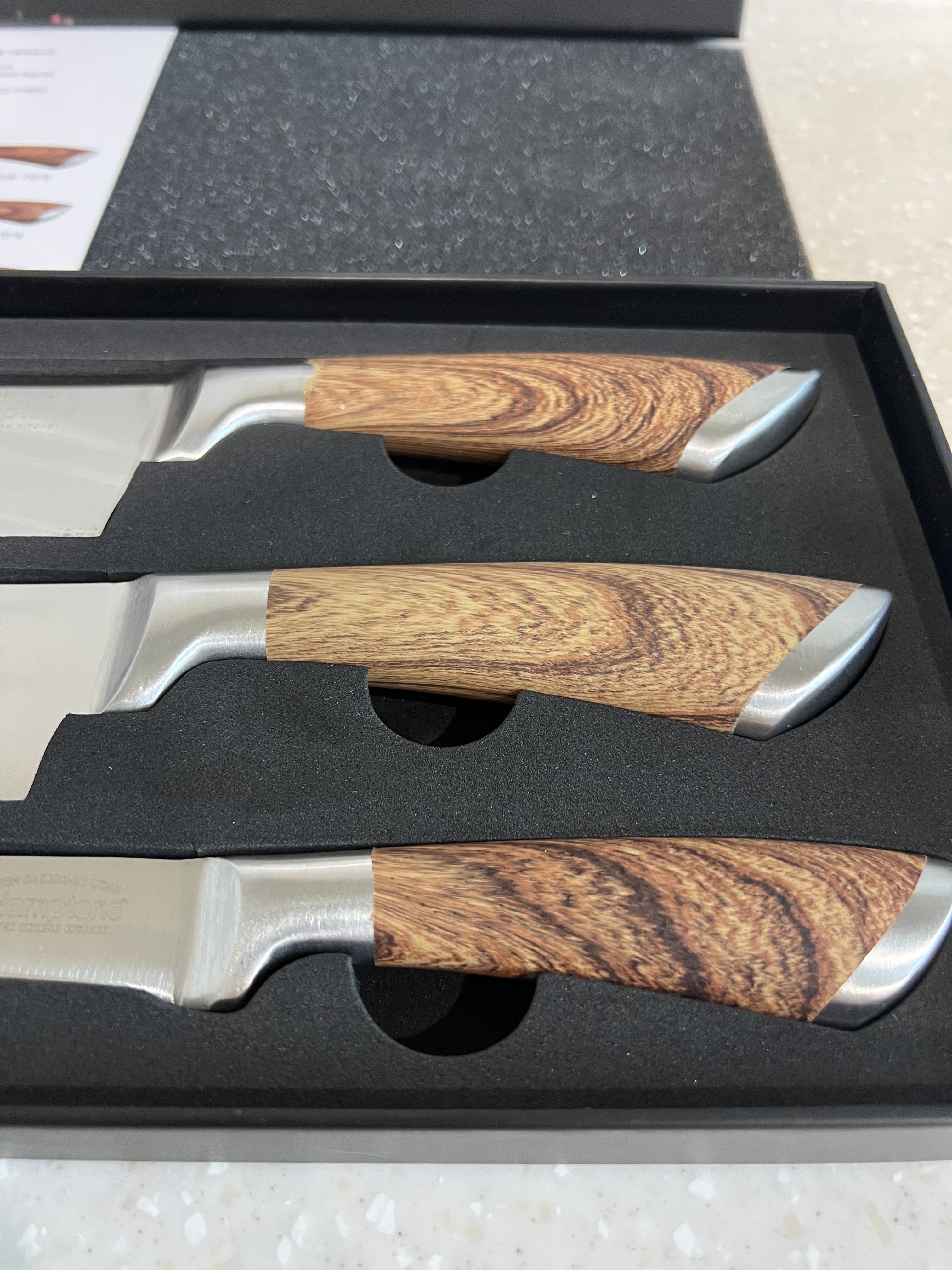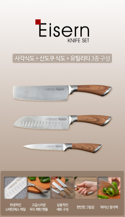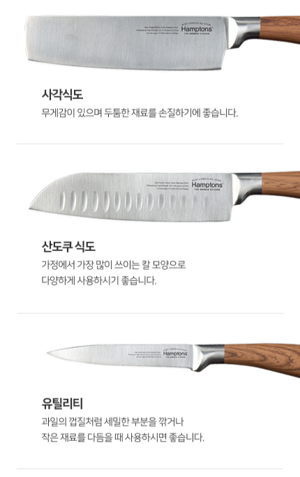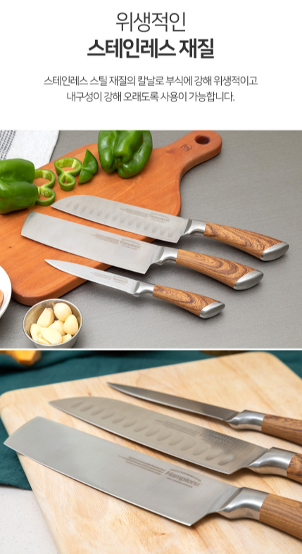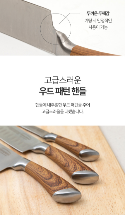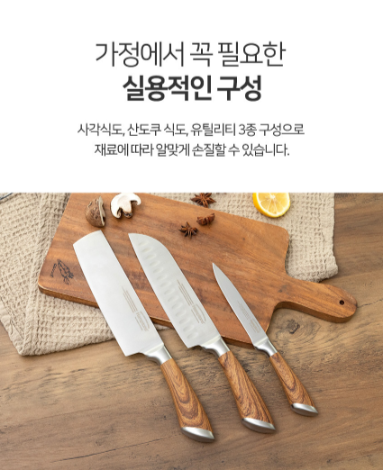 - 고급스러운 우드 패턴 핸들을 포인트로준 스테인레스 재질 칼 세트로 요리에 꼭 필요한 3종 구성