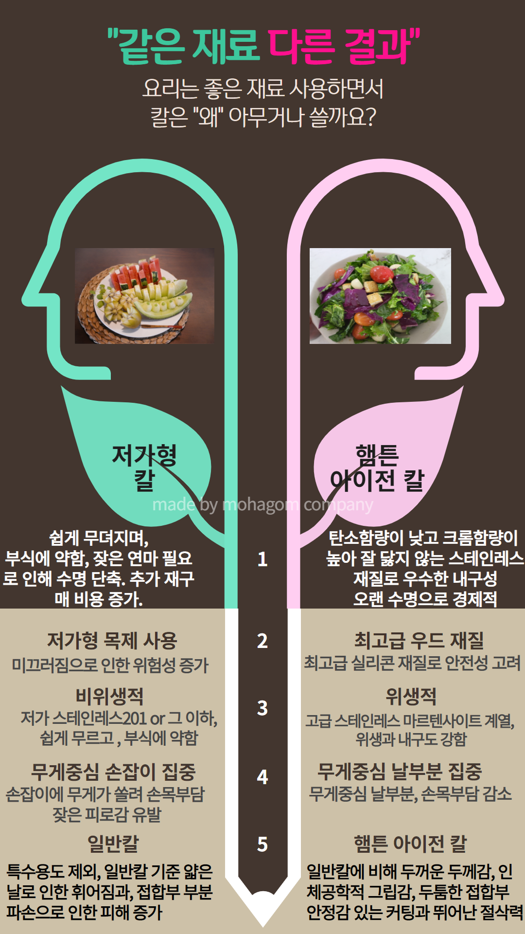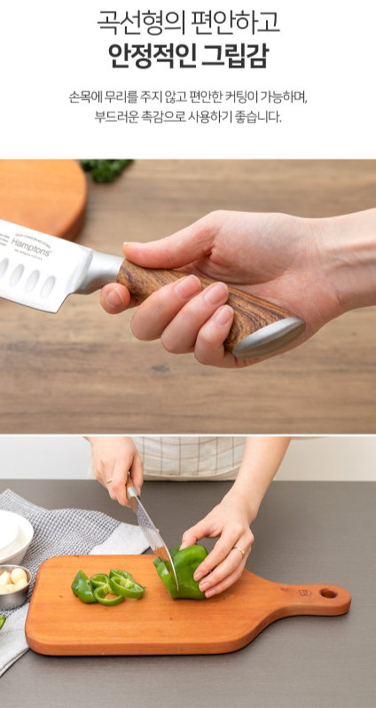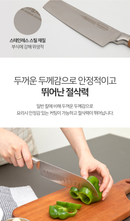 - 일반칼에 비해 두꺼운 두께감 , 인체공학적 그립감 , 두툼한 접합부 , 안정감 있는 커팅과 뛰어난 절삭력