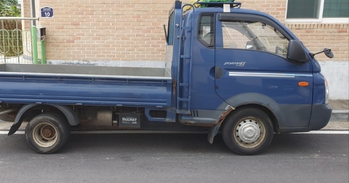 부식되고 찌그러진 화물차적재함 적재함문짝 수리하지 마시고