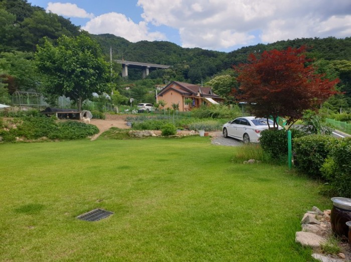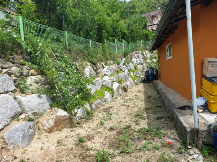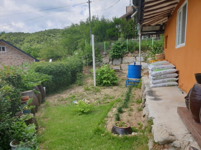 주택의 좌측은 진입로가 있고 주택을 빙 둘러 매화나무와 꽃이피는 나무로 심어놓으셨어요~