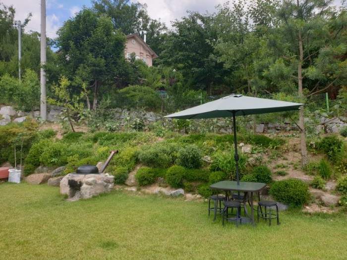 잔디밭에 파라솔이 있는 테이블에서 식사를 하시면 밥맛도 더 좋을거 같아요