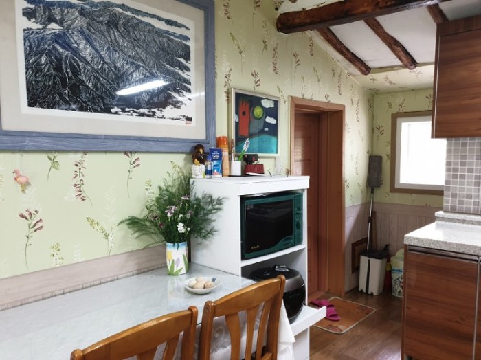 벽지와 액자가 잘어울리고 식탁에는 야생화꽃병이 이쁘게 자리하고 있네요