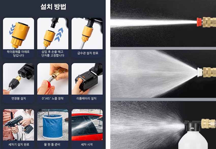 밧데리2개드림, 노즐(직선1개, 45도1개) 충전기, 거품분사통, 물호수
