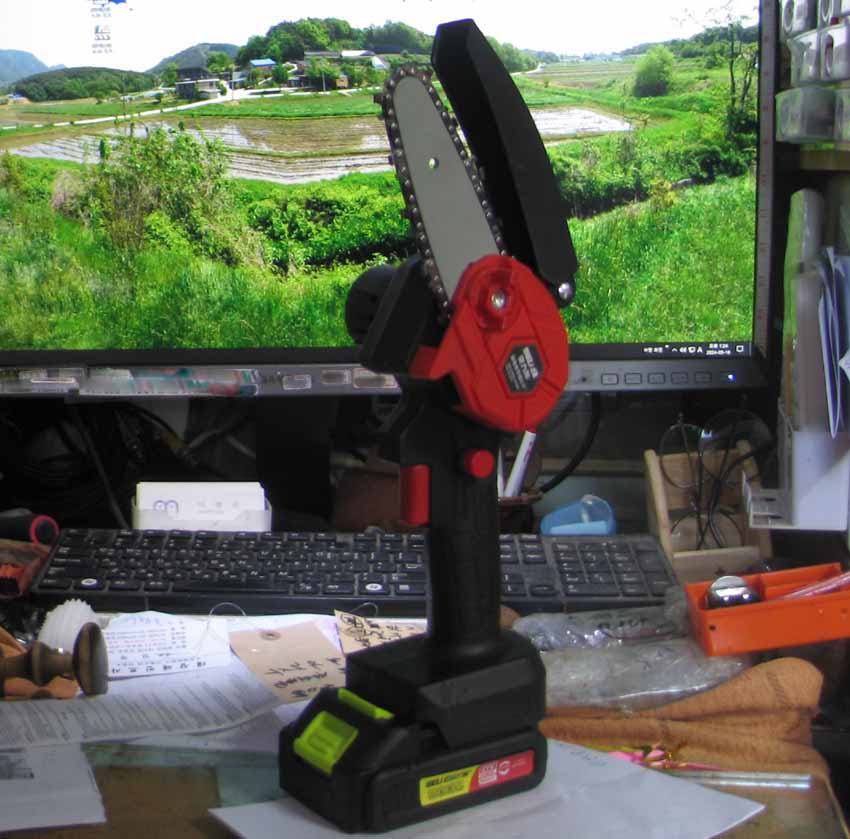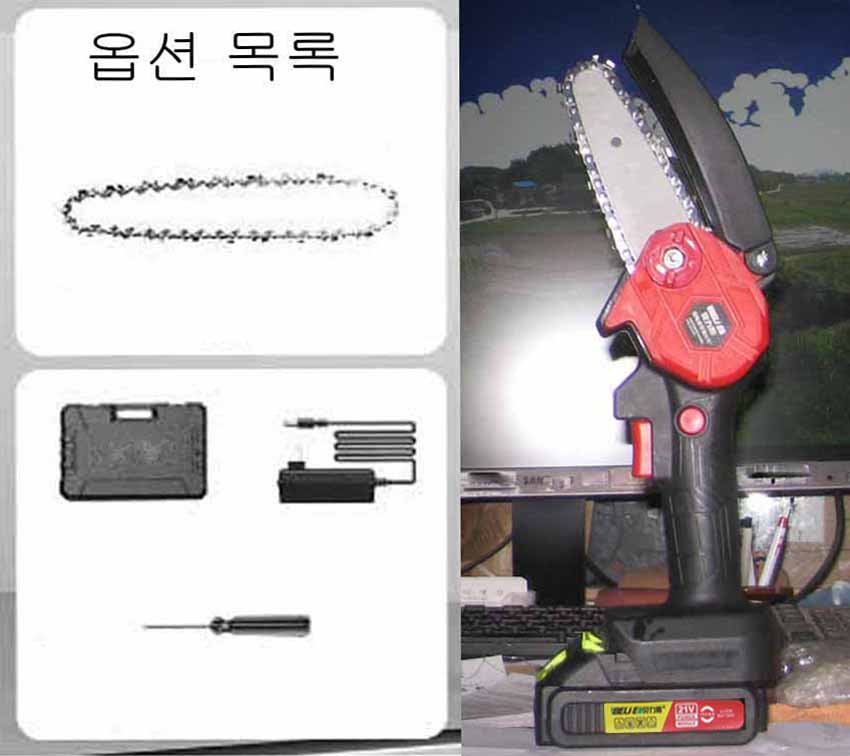 새것이며 , 밧데리1개, 아답터, 체인톱날1개, 공구, 이동프라스틱가방집 드림